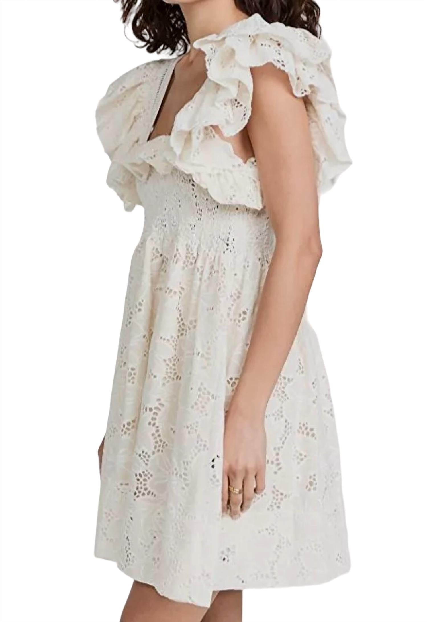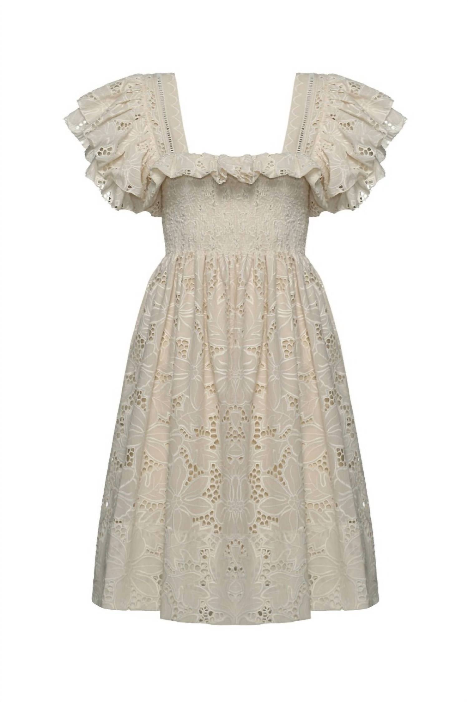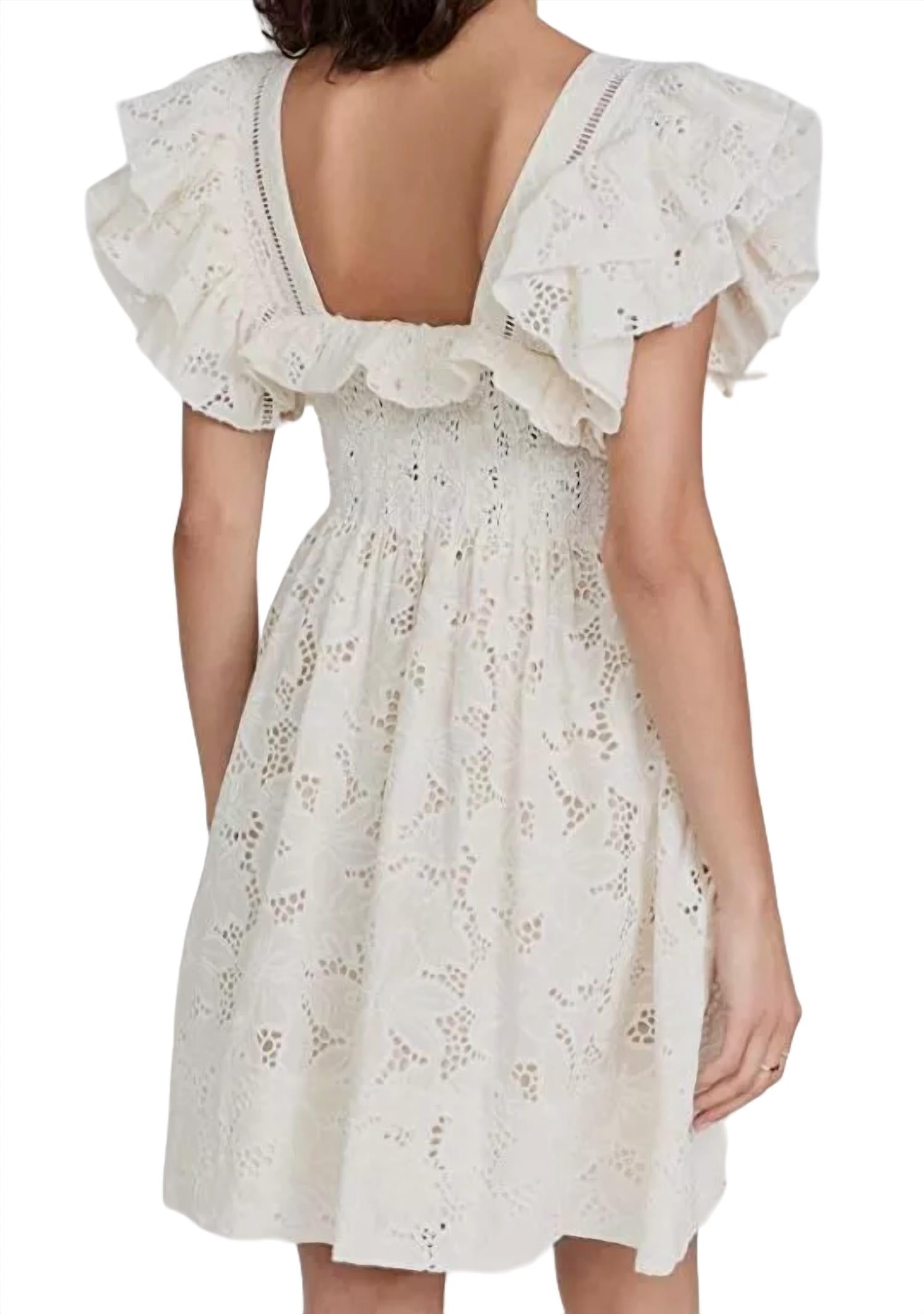 Присборенный эластичный пояс, отделка оборкой, квадратный вырез, рукава-крылышки, вышитый узор с люверсами. Верх - 100% хлопок. Подкладка. Уход - Только сухая чистка.