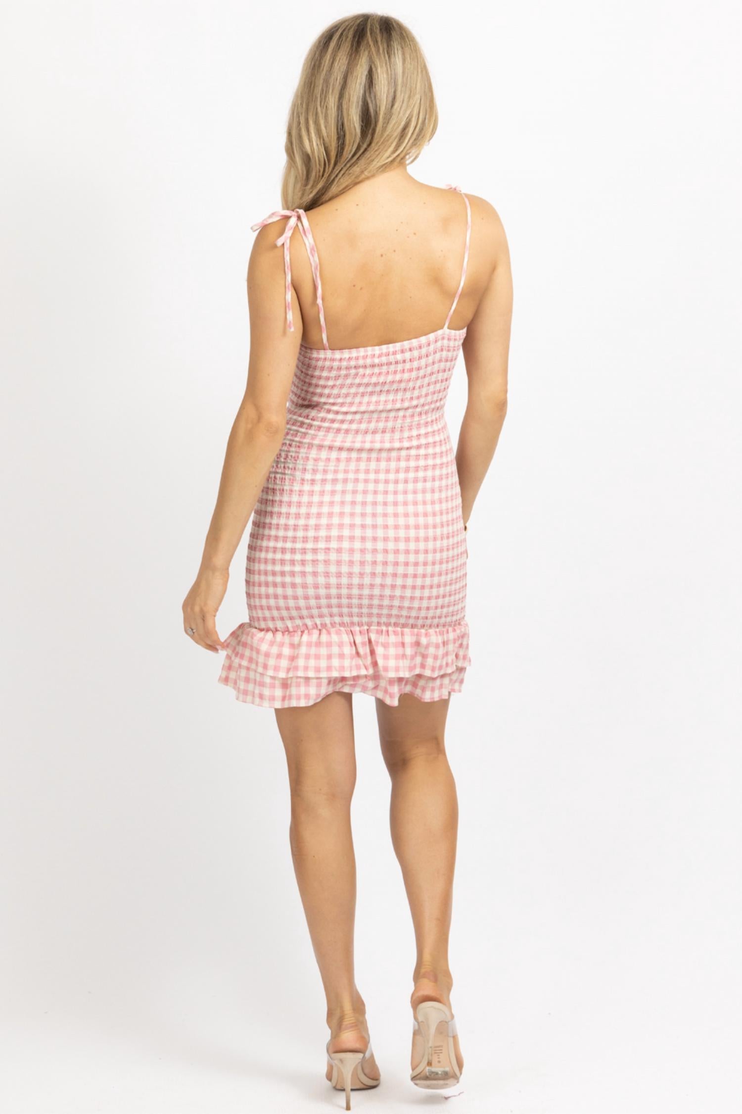 Присборенный, оборчатый подол, бретельки-спагетти, завязка спереди, открытая передняя часть. 80% полиэстер, 30% вискоза. На модели размер small. Рост 5'8, размер платья 2.