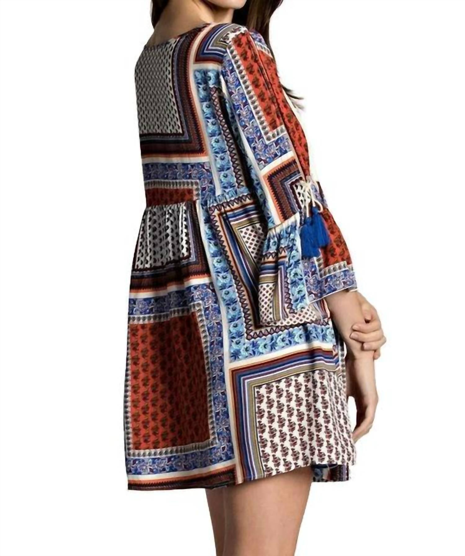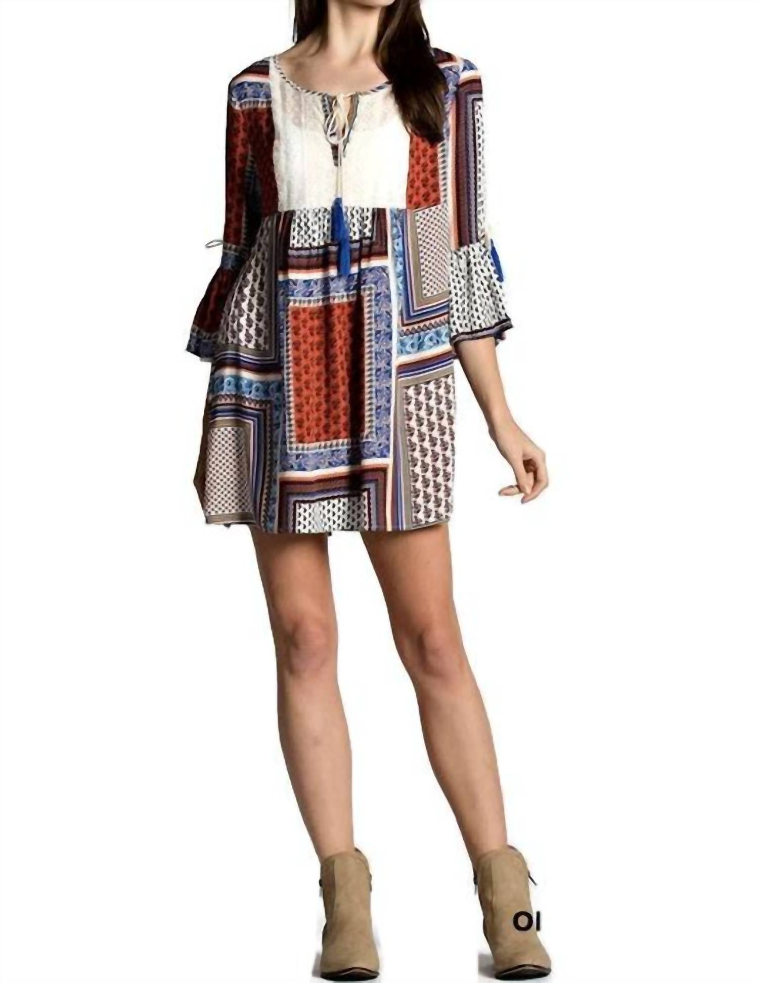 Разделенный V-образный вырез с завязками-кисточками. Открытые рукава с оборками и кисточками. Кружевной нагрудник. Высокая талия. Мини-силуэт А-силуэта.