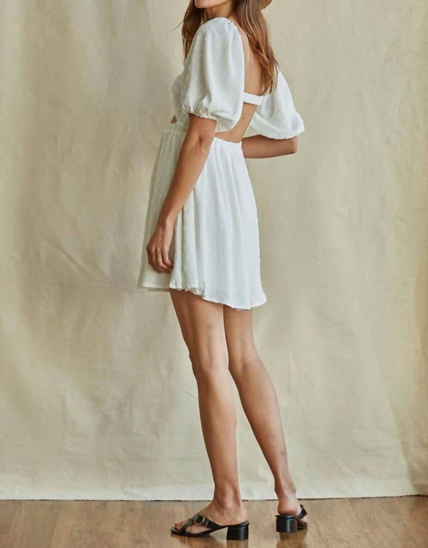 Тканый газ. Вырез сердечком. Платье с пышными рукавами и вырезом на талии. Текстура в мелкий швейцарский горошек. Ручная стирка. 100% хлопок.