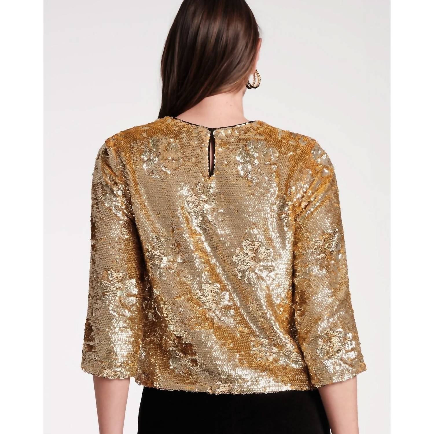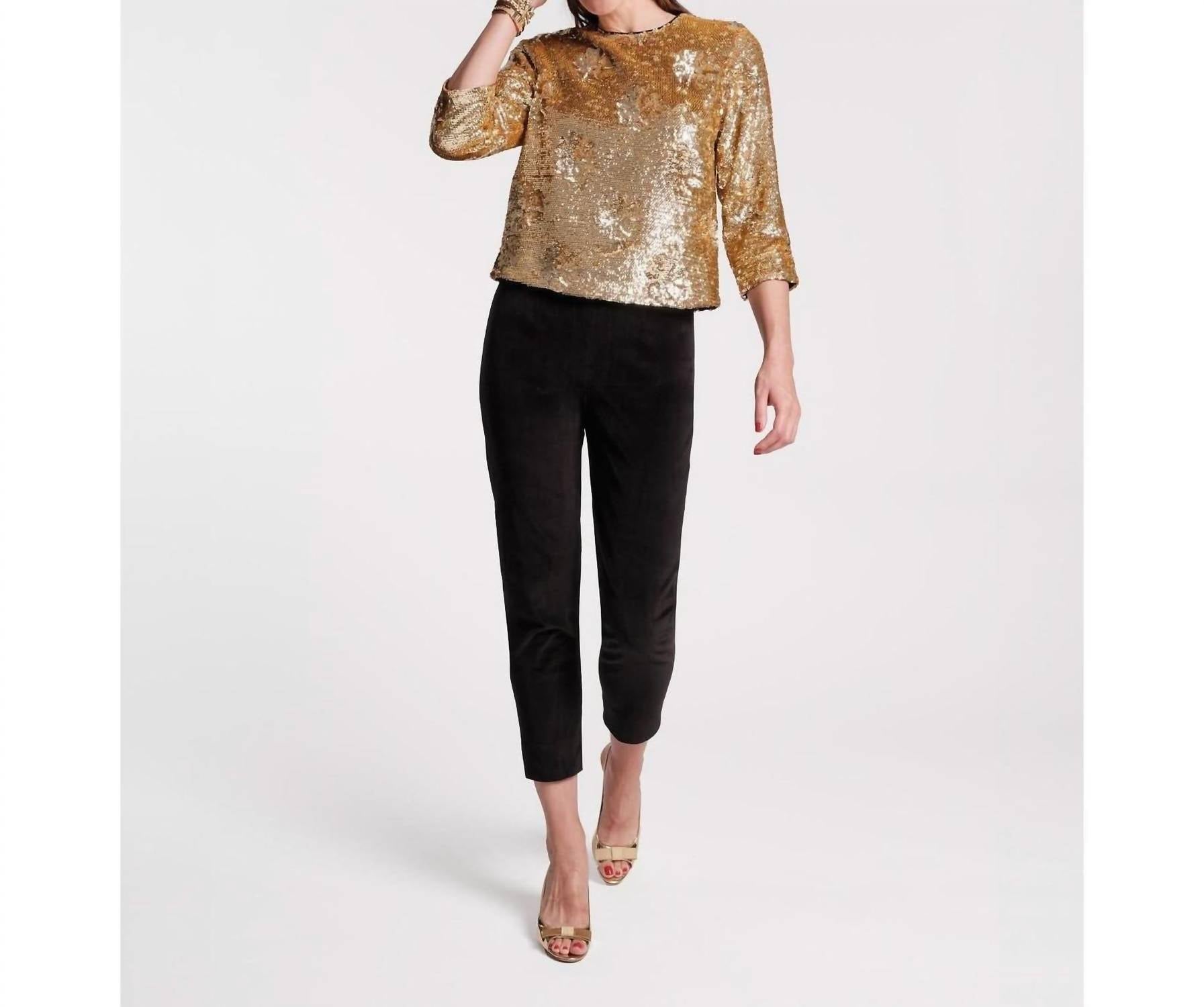 Топ с круглым вырезом, пайетками и длинными рукавами. Контрастные цветочные аппликации. 100% вискоза. На подкладке. Сделано в Индии. Только профессиональная химчистка.
