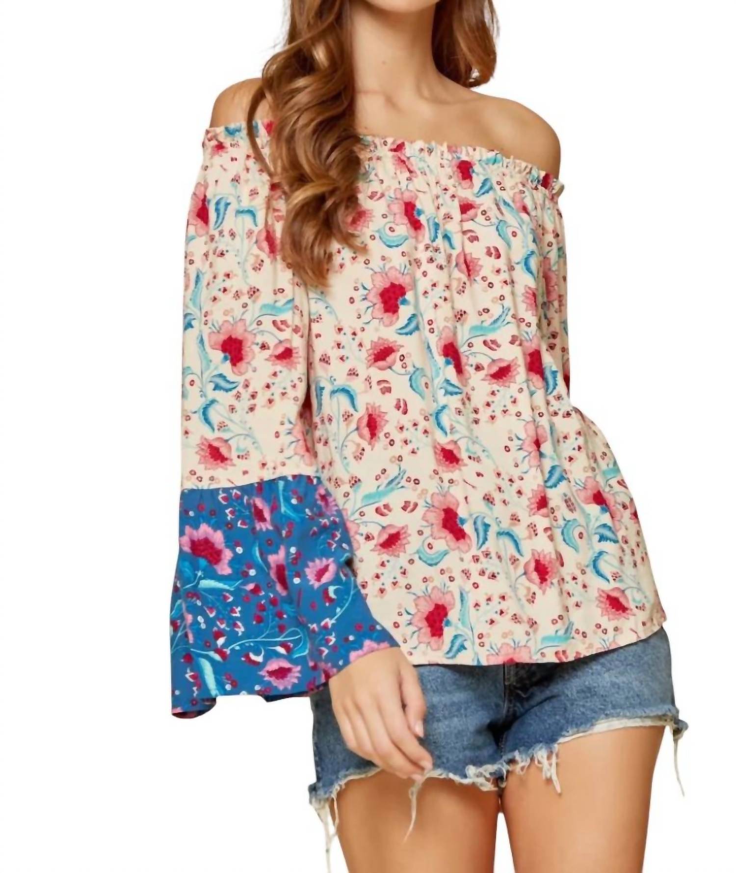 Этот топ с открытыми плечами отличается контрастными принтами, красивыми расклешенными рукавами и струящимся лифом. Изготовлен из 100% вискозы, размер small имеет длину 23".