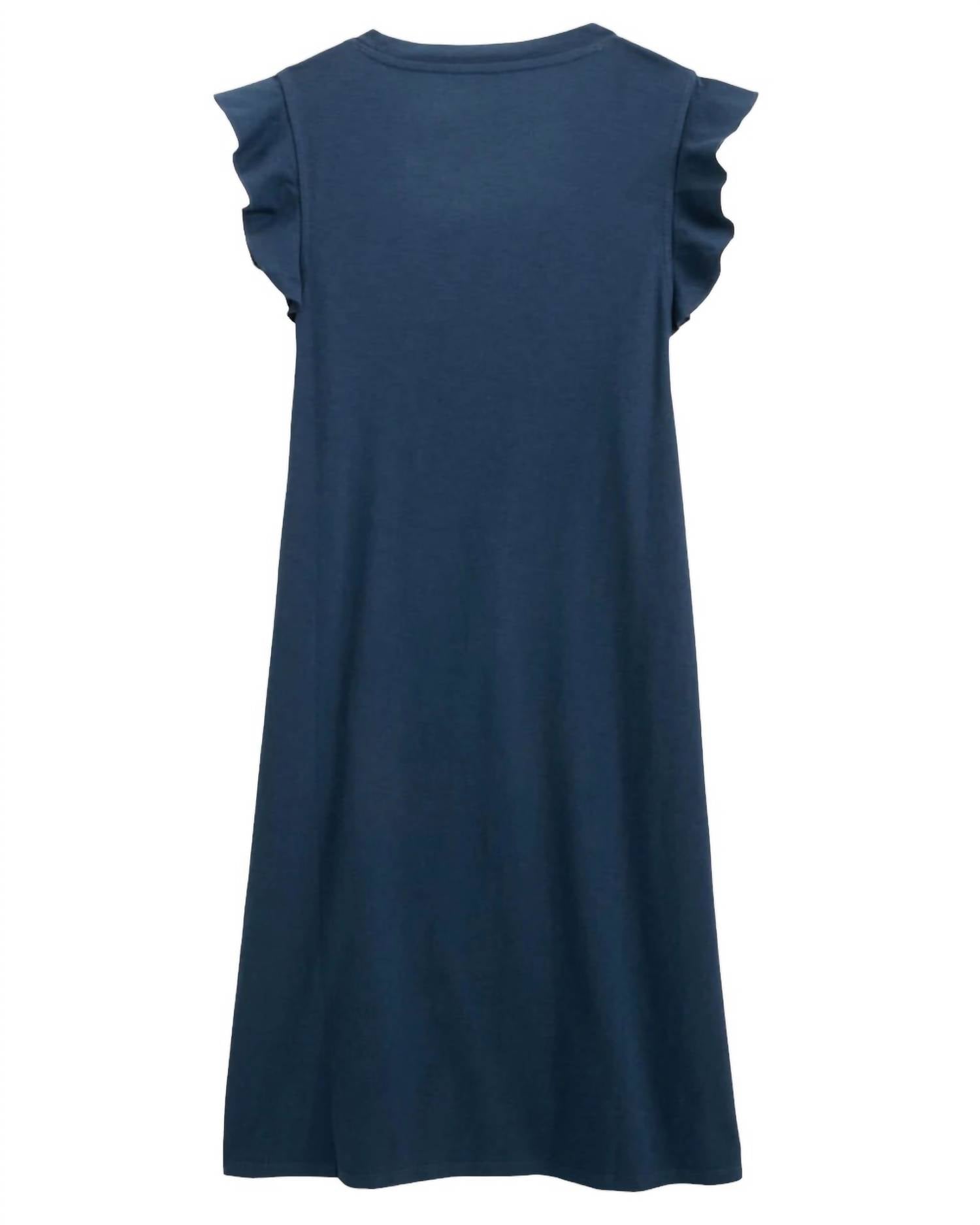 «Ощутите универсальность с этим однотонным синим платьем-футболкой. Оно имеет круглый вырез и рукава с оборками, изготовлено из 100% хлопка для максимального комфорта и стиля».