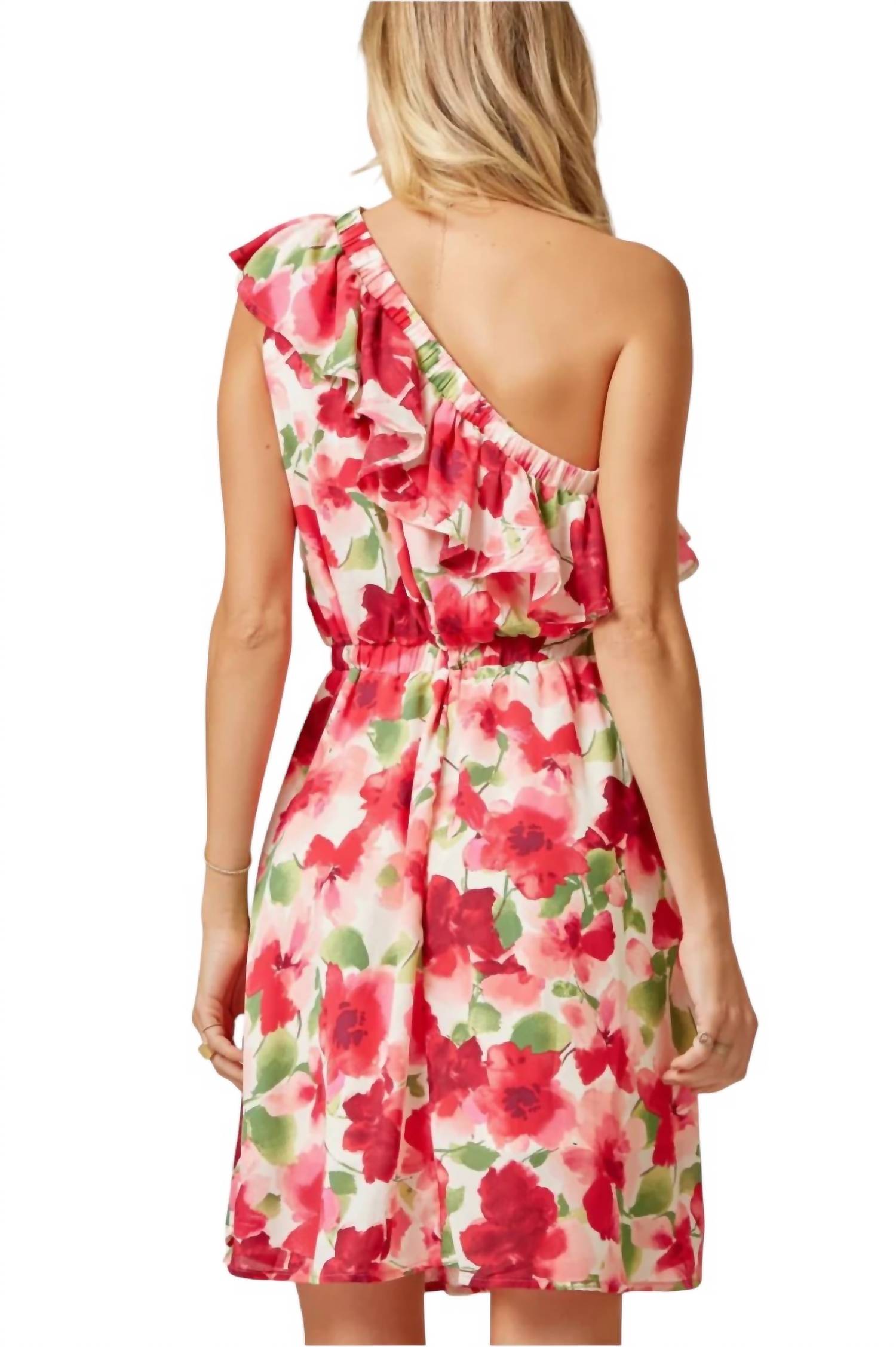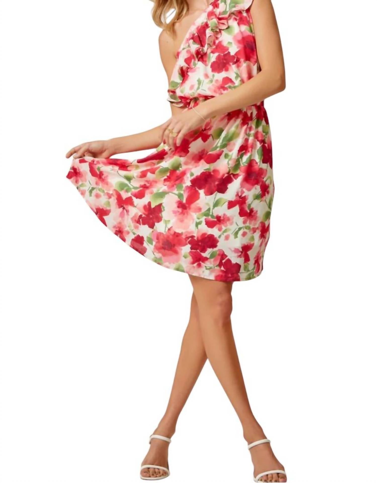 Это платье с цветочным принтом имеет дизайн на одно плечо с симпатичным лифом, полностью на подкладке и эластичной талией. Оно имеет длину мини и изготовлено из 100% полиэстера.