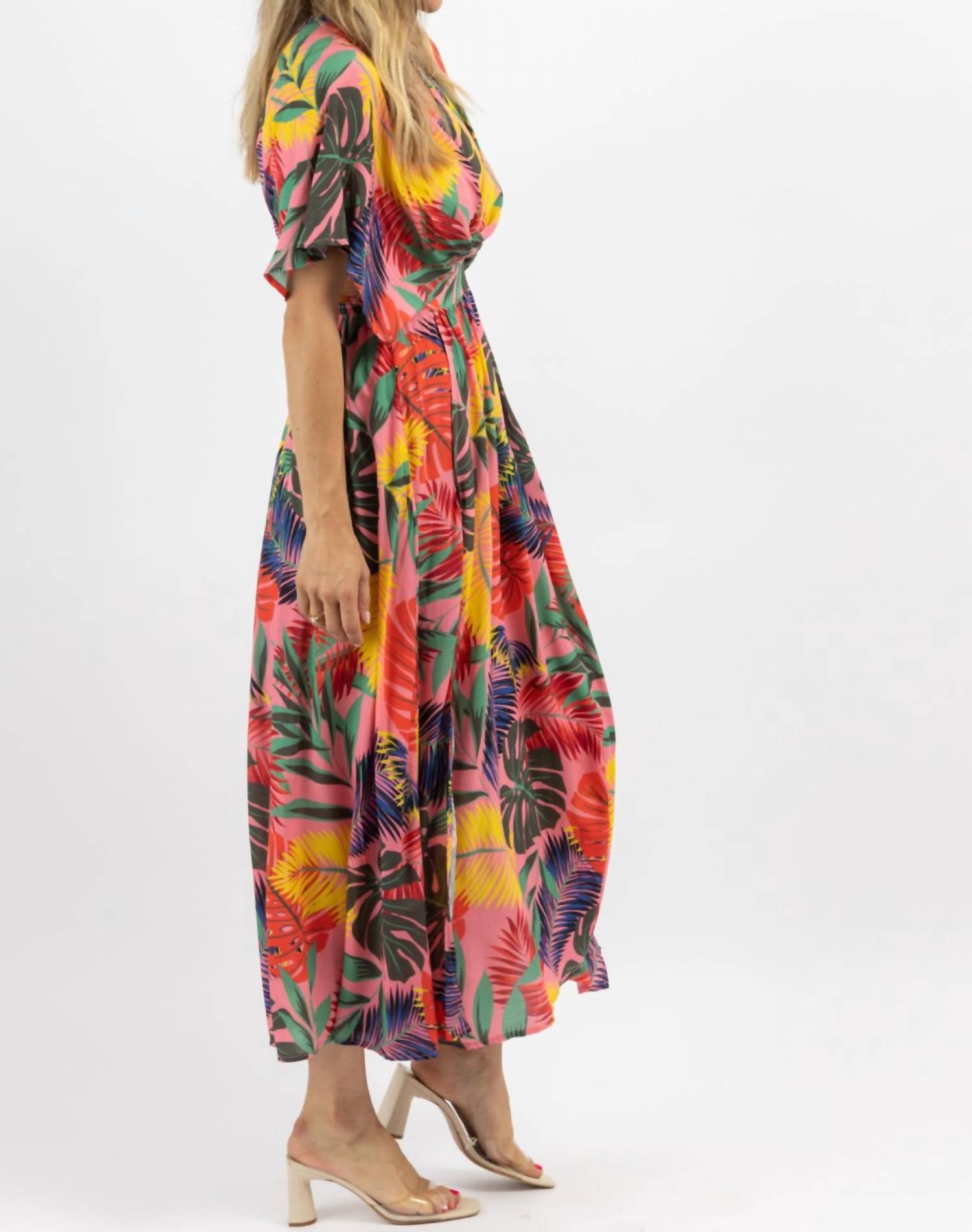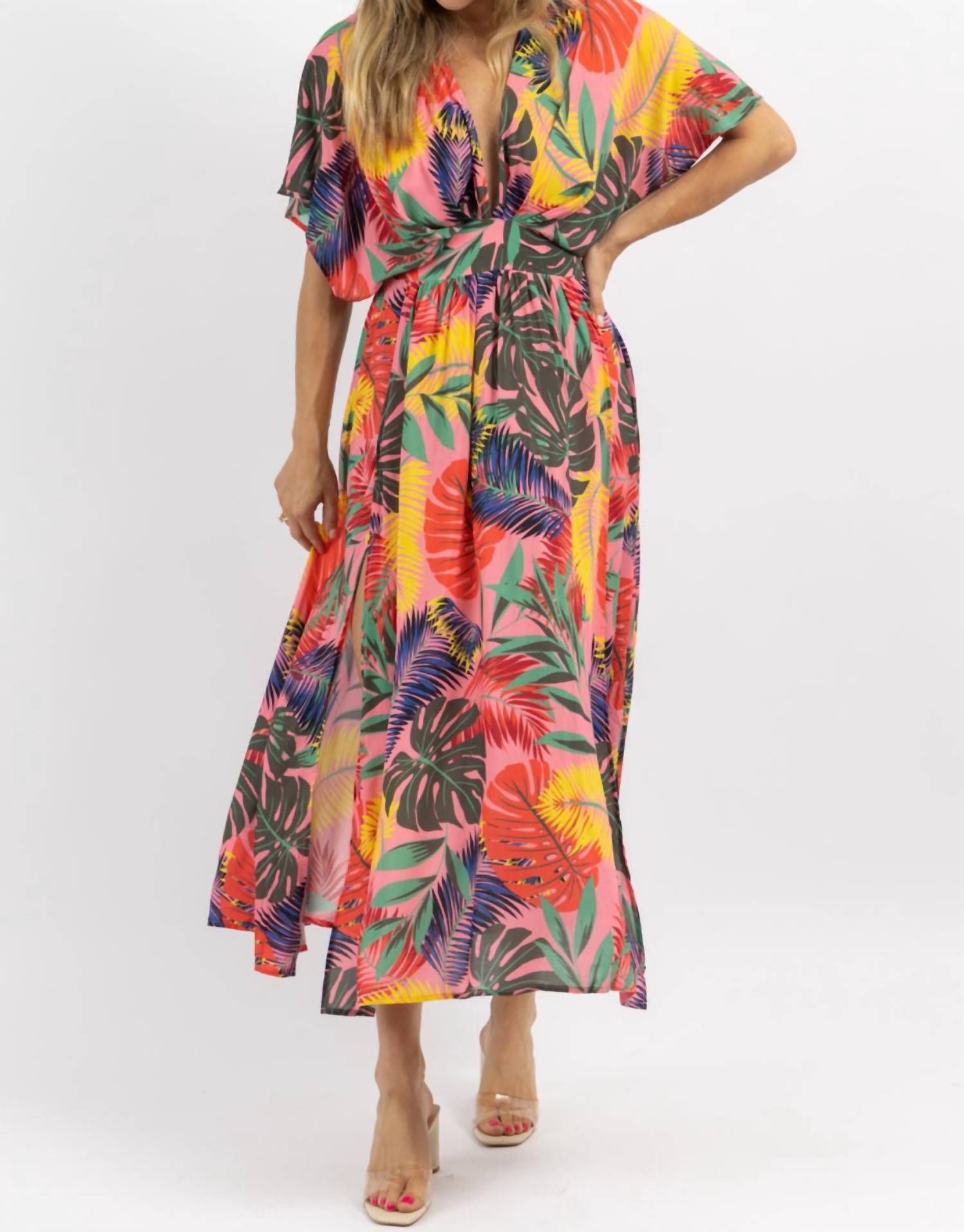 V-образный вырез, короткие рукава, боковой разрез, длина макси, тропический принт. 100% вискоза. На модели размер small, рост 5'8, размер платья 2.