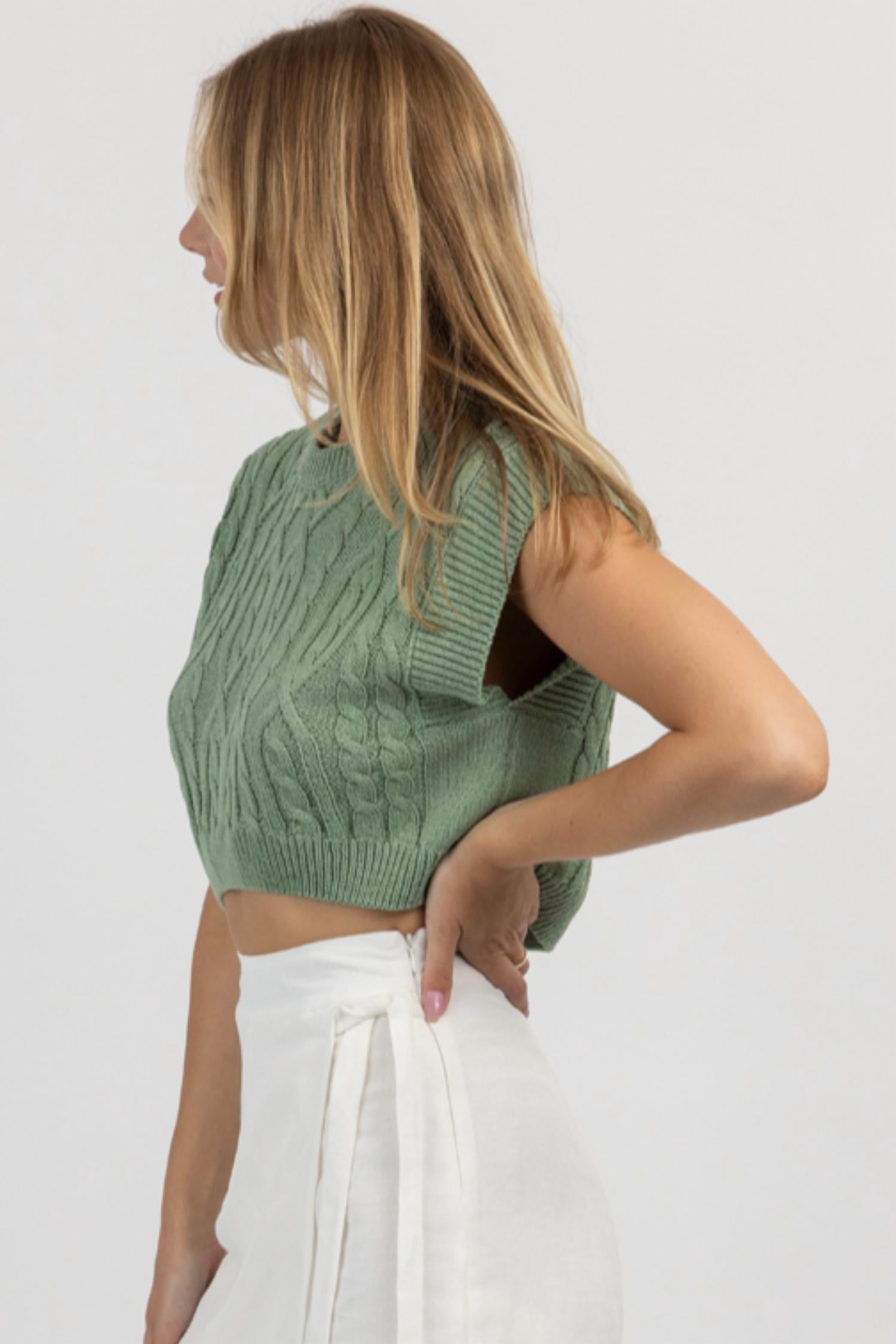 Без рукавов, косичная вязка, укороченная, без рукавов, круглая горловина, ребристый подол. 100% полиэстер. На модели размер small, рост 5'8, размер платья 2.