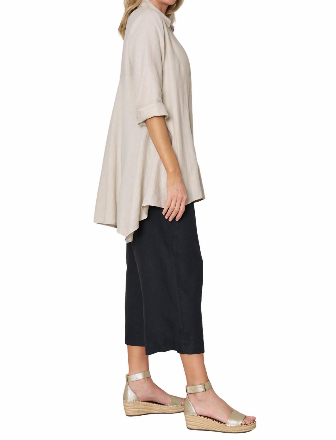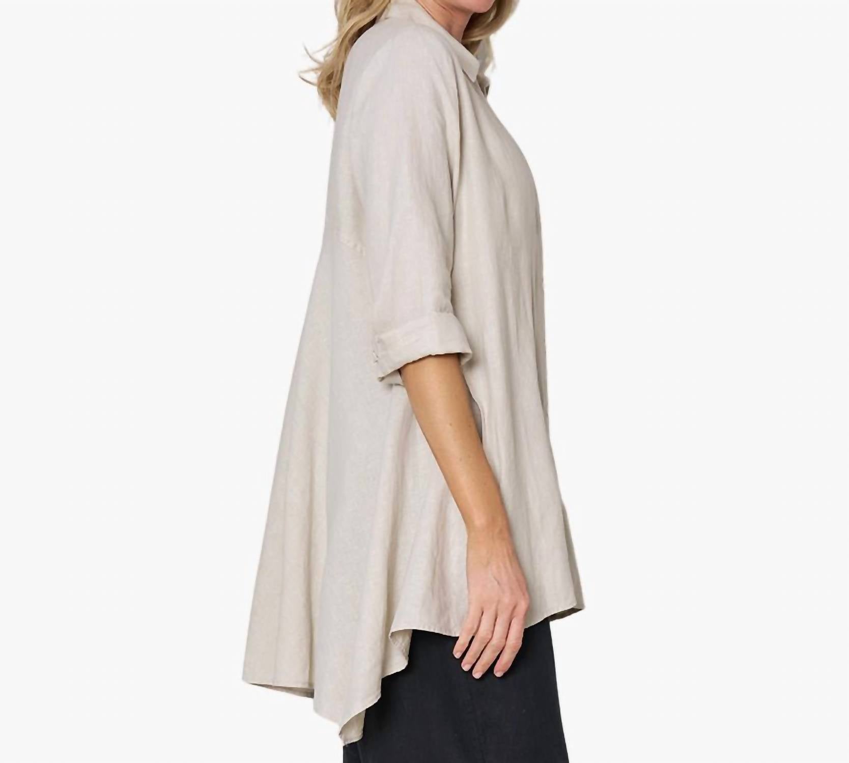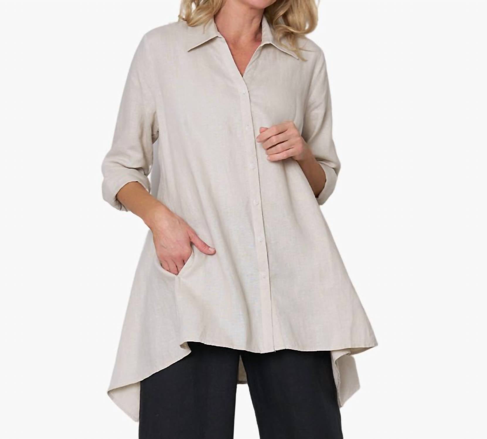 Косой крой вставок. V-образный вырез и удобный А-силуэт. Карманы в швах и уникальная форма подола. Длина по спинке составляет приблизительно 31 дюйм для размера S. Модель выше ростом 5 футов 11 дюймов носит размер S. 100% лен. Импортный. Машинная стирка.