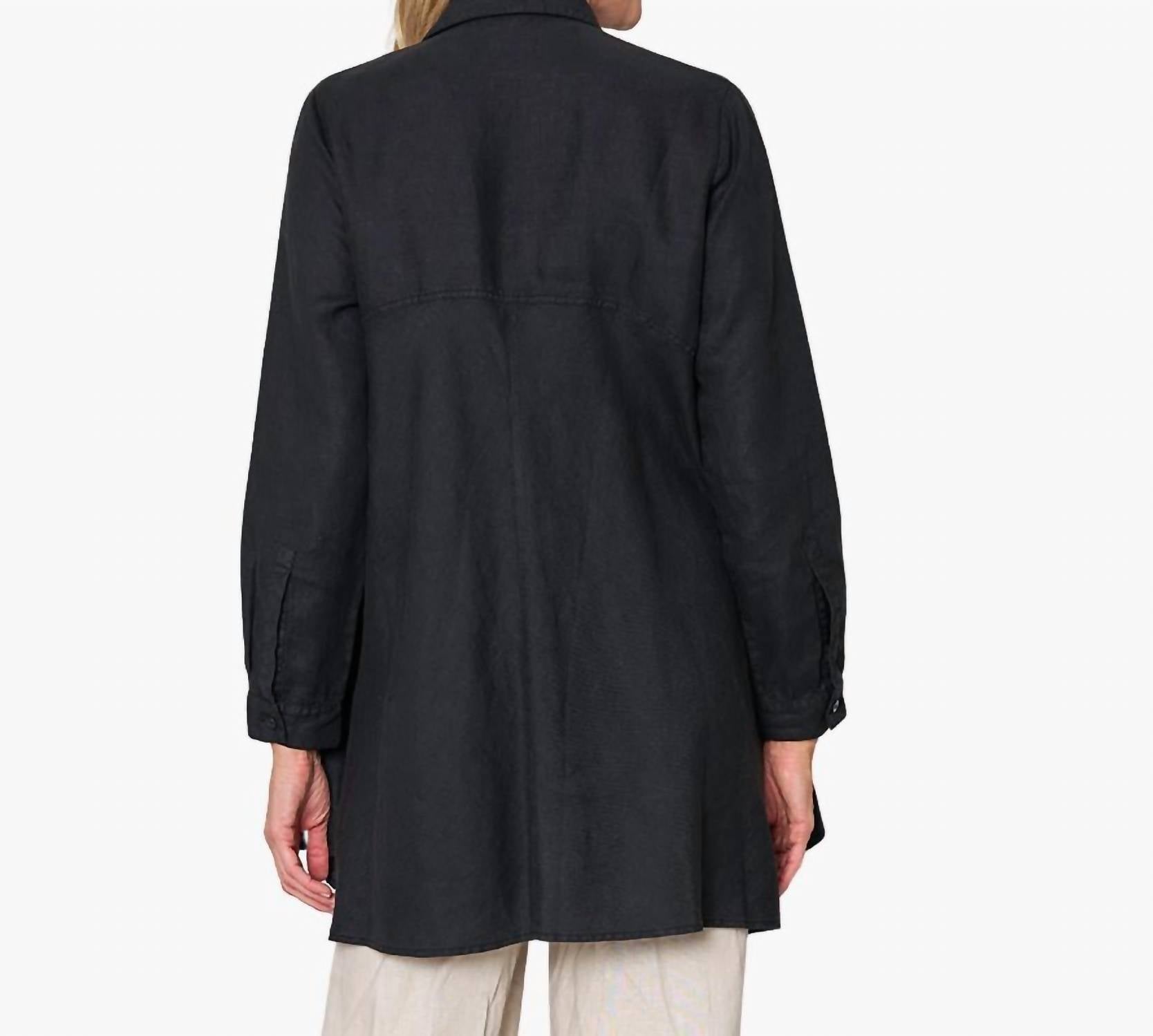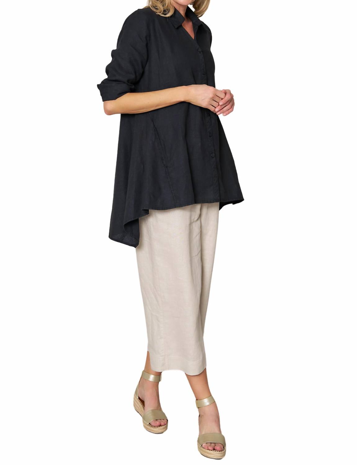 Косой крой вставок. V-образный вырез и удобный А-силуэт. Карманы в швах и уникальная форма подола. Длина по спинке составляет приблизительно 31 дюйм для размера S. Модель выше ростом 5 футов 11 дюймов носит размер S. 100% лен. Импортный. Машинная стирка.