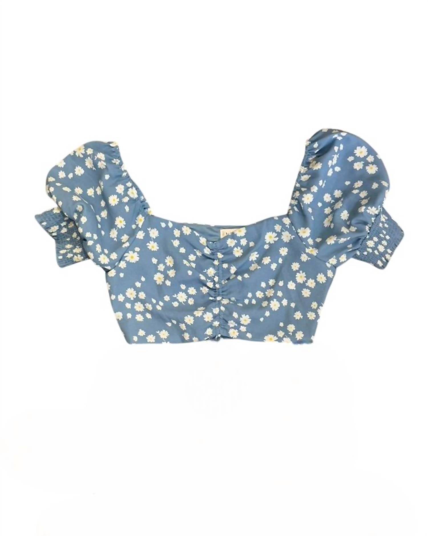 Укороченный топ с короткими рукавами и вырезом в форме сердечка. Регулируемая сборка по центру с завязкой. Эластичные рукава-фонарики. Присборенная задняя панель.