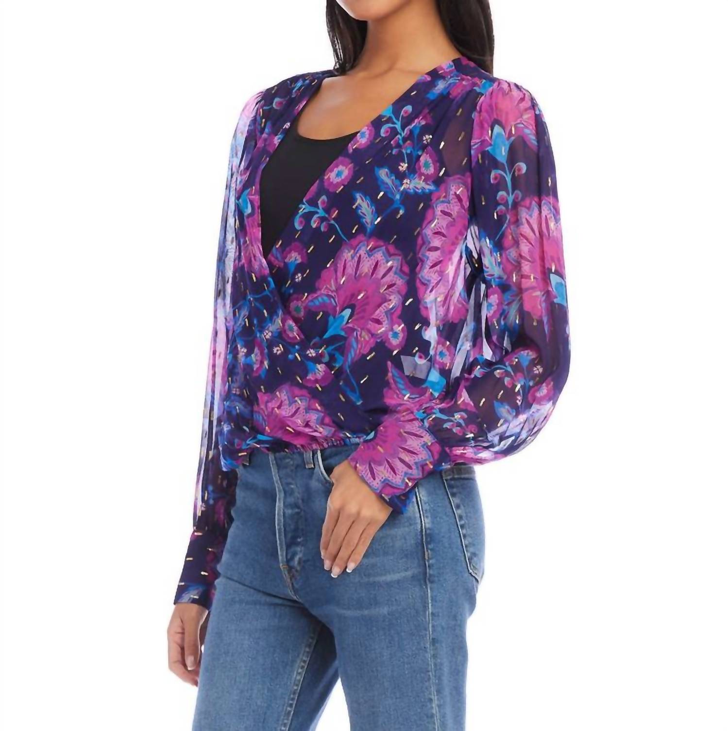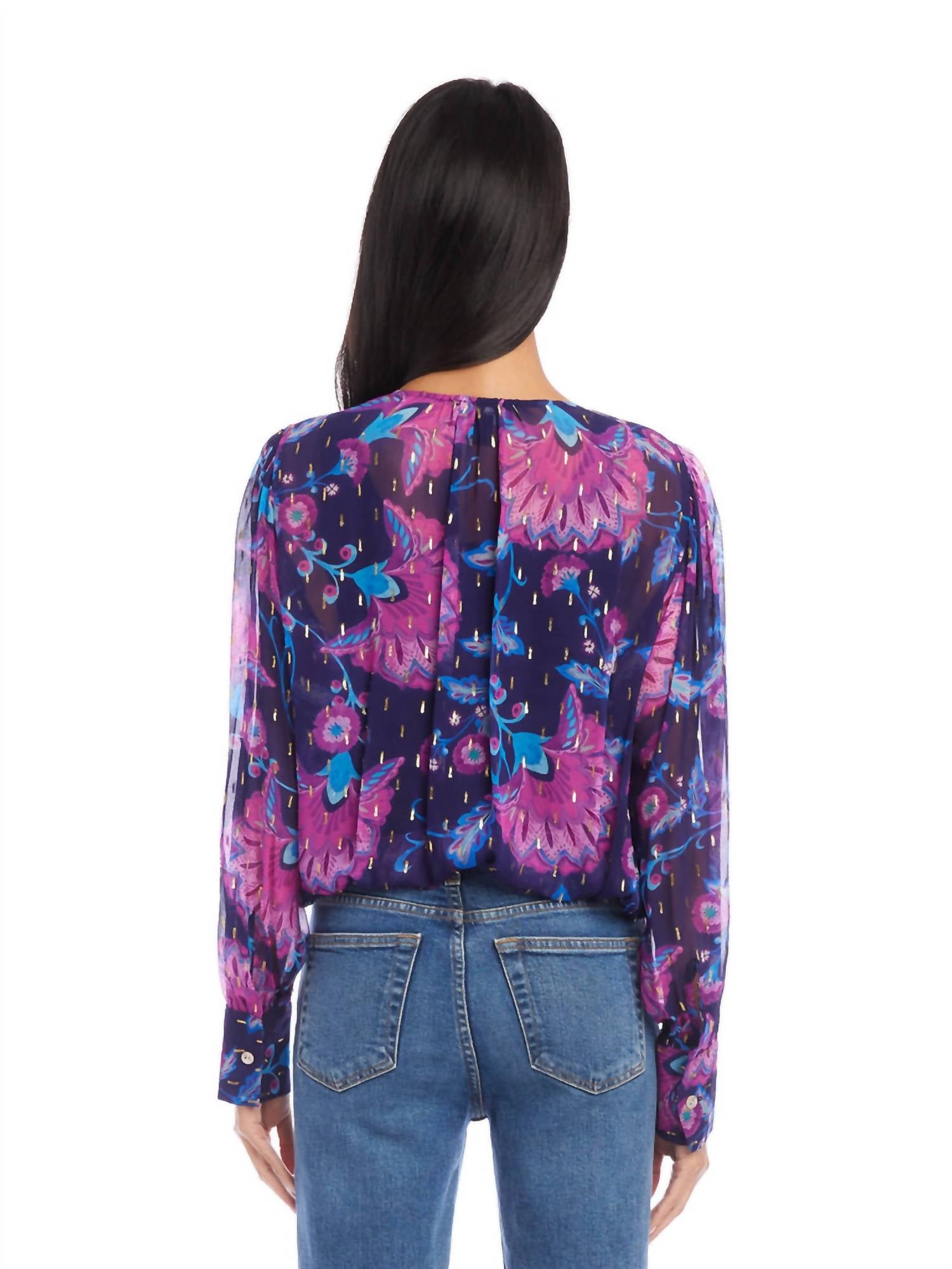 С классическим принтом, привлекательным силуэтом и деталями в виде точек с застежками. Длинный рукав. Вырез горловины с запахом. Манжеты на пуговицах. Длина — 22 дюйма. Только сухая чистка. 99% вискоза, 1% металлик. Сделано в США.