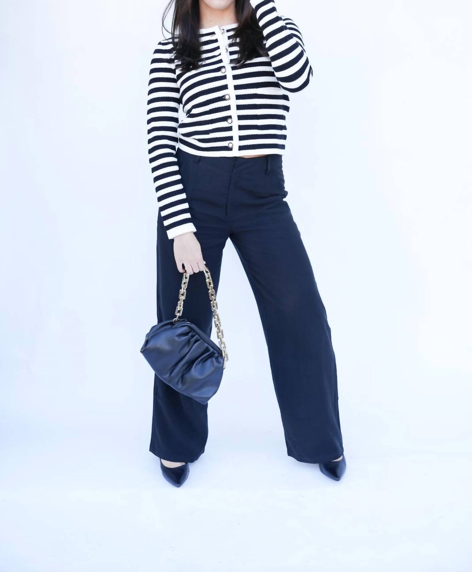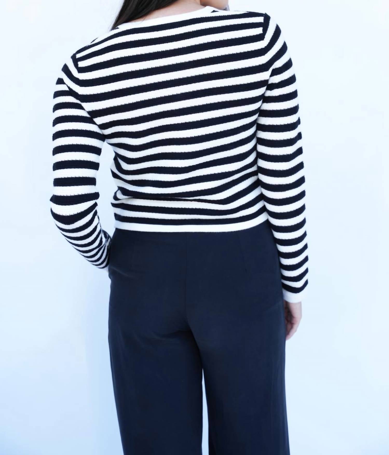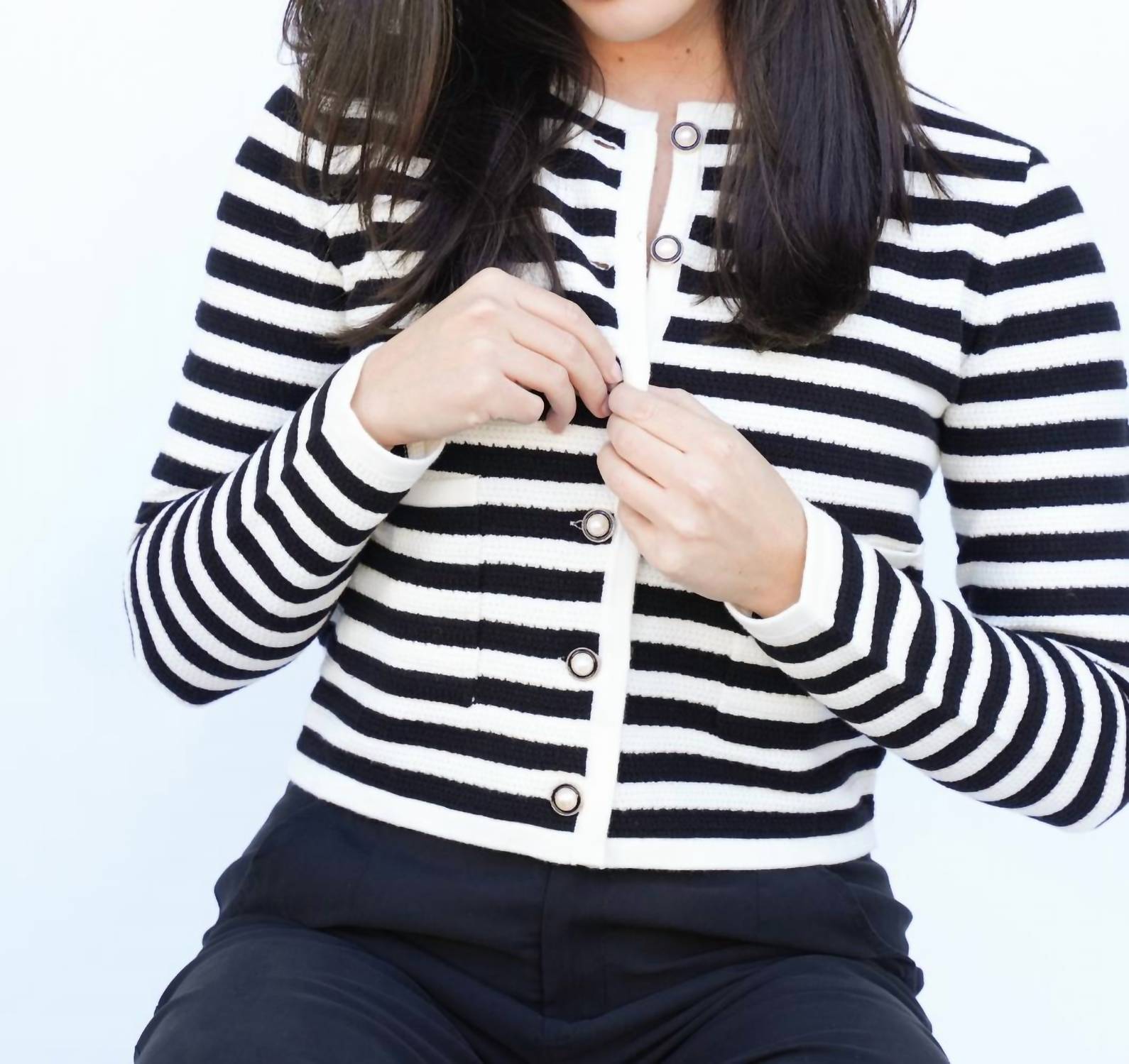 Этот кардиган станет фаворитом при смене свитеров. Представляем кардиган Stella от Falcon Park, идеальное сочетание стиля преппи и шика. Этот кардиган с длинными рукавами изготовлен из вискозной смеси с черно-белыми полосками для дополнительной элегантности. Длина кардигана составляет около 19,5 дюймов, он оснащен практичными передними карманами и классическим круглым вырезом. Застежка - застежка на пуговицы.