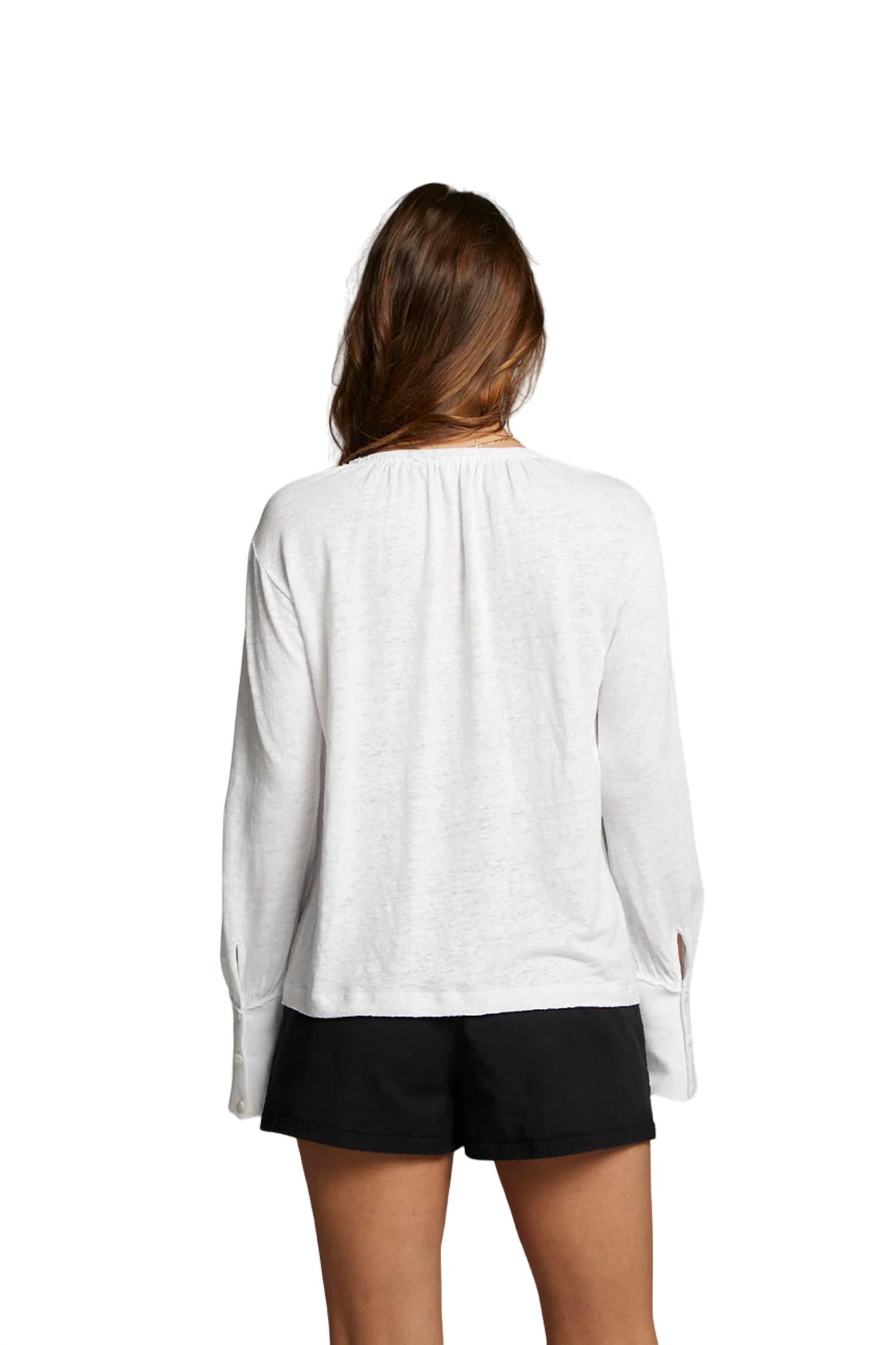 Женский топ с длинными рукавами, V-образным вырезом и манжетами на пуговицах. 97% лен, 3% спандекс. Импортный.