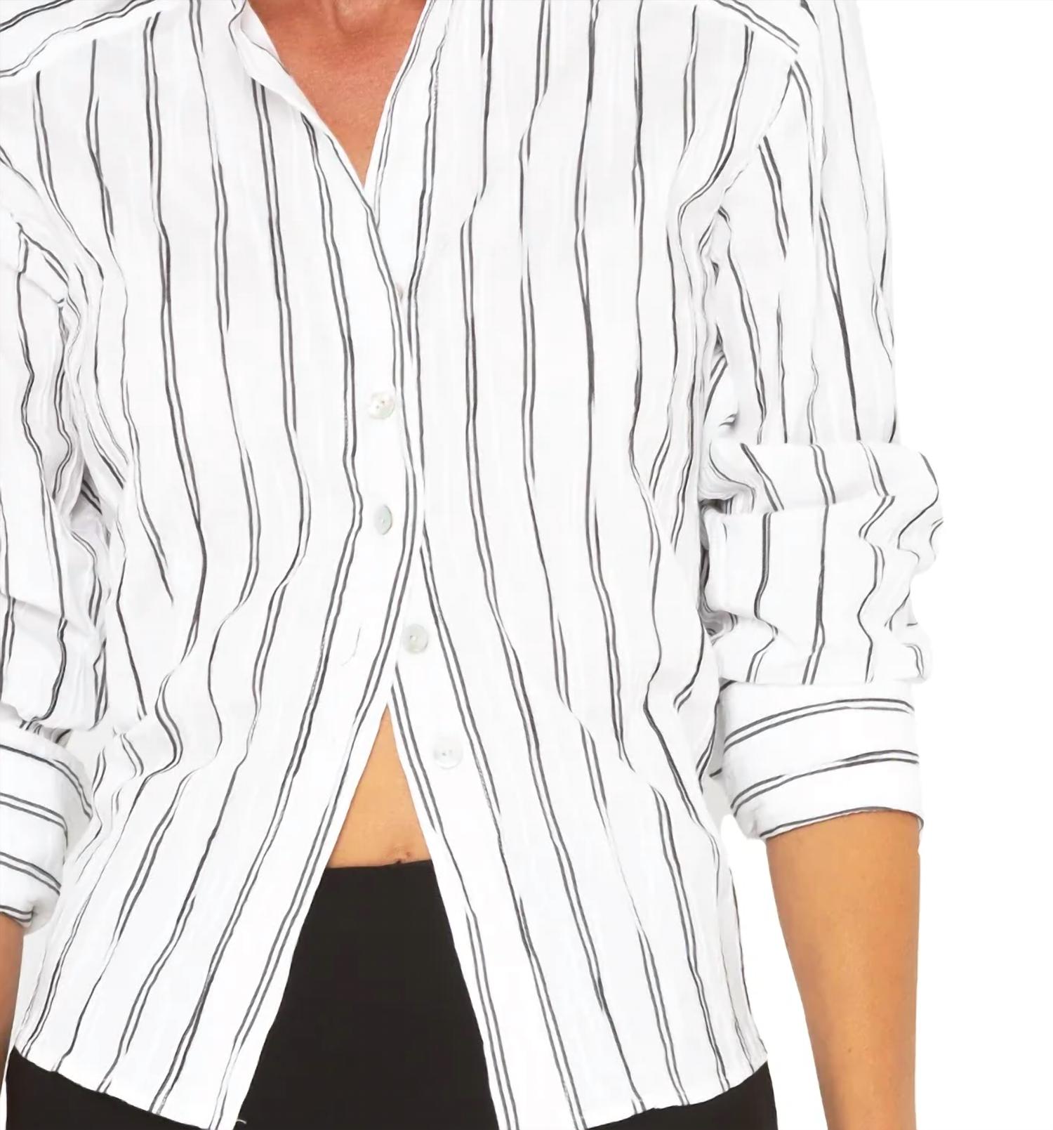 Классическая рубашка на пуговицах, которая никогда не выйдет из моды. Поднимите свой гардероб с помощью Charlotte Top от JBQ, шикарной и универсальной вещи с вневременным черно-белым полосатым дизайном. Эта рубашка на пуговицах с длинными рукавами и классическим воротником изготовлена ​​из удобной хлопковой смеси. Застежка на пуговицы обеспечивает легкость ношения, что делает ее надежным выбором для различных случаев. Примите неизменную привлекательность полос с этим изысканным дополнением к вашей коллекции.