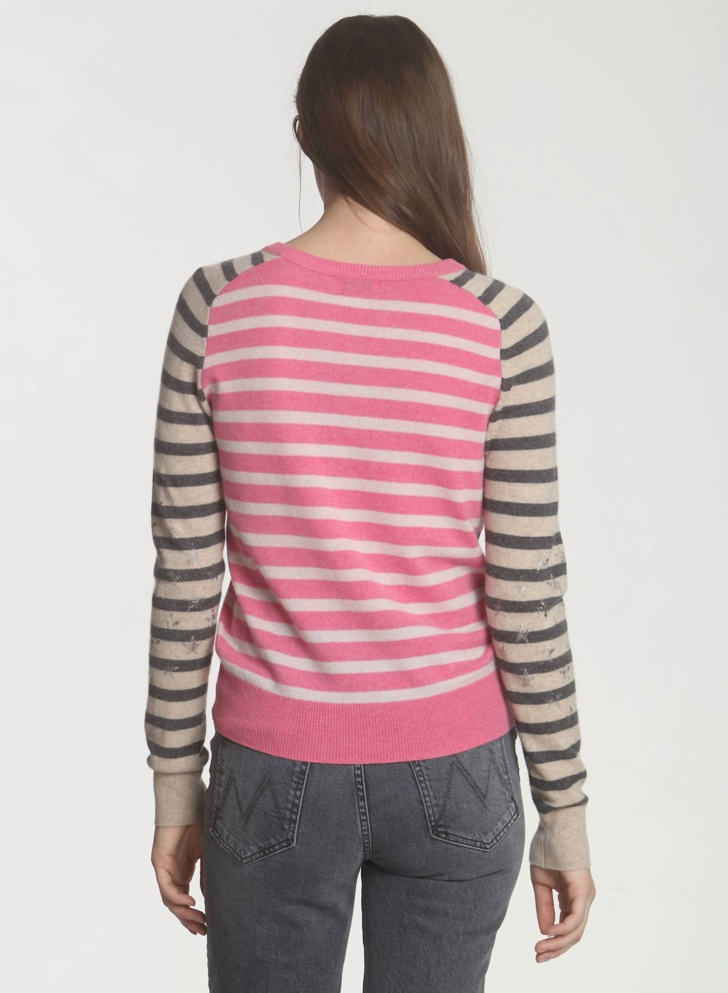 Смешанный полосатый воротник-стойка с выцветшими металлическими звездами, едва заметными на рукаве. Длинный рукав. Рост модели 5 футов 9 дюймов, на ней размер small. Облегающий крой. 100% кашемир. Ручная стирка или химчистка.