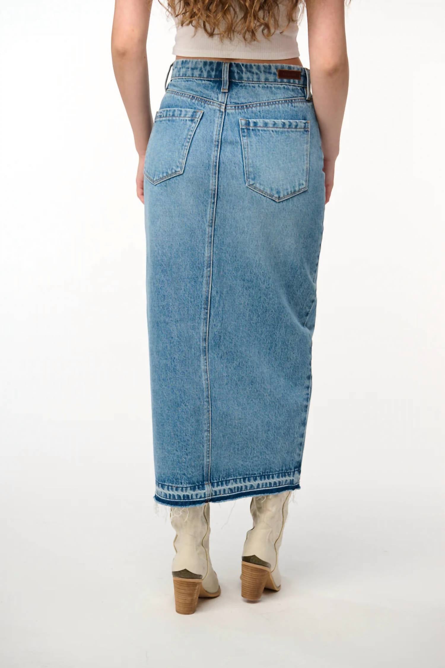 Идеальная джинсовая юбка миди-длины с модным разрезом. Придает любому ансамблю элегантность и универсальность. Изготовлена из 100% хлопка. Удобная застежка на пуговицы. Высокая посадка.