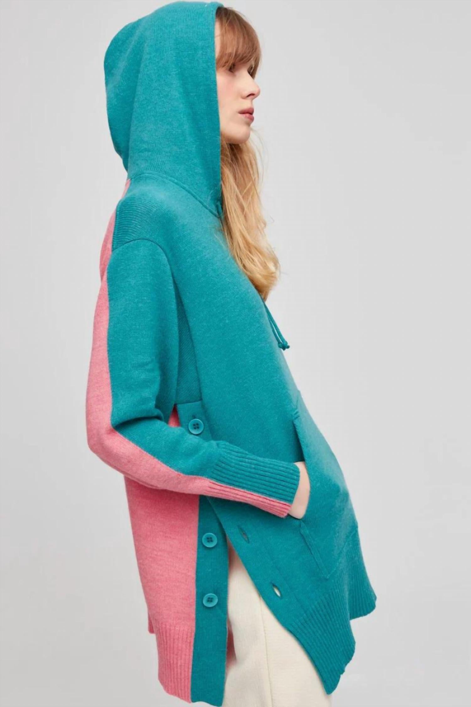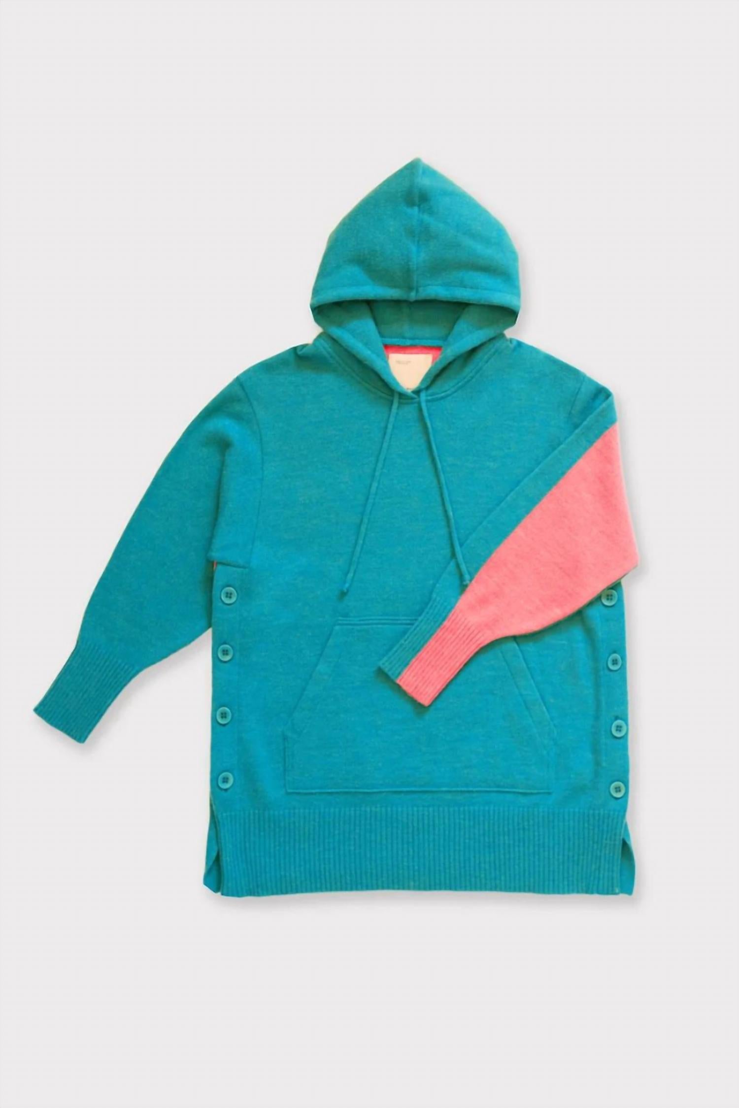 Это свободная толстовка с капюшоном в стиле пуловера с передним карманом-кенгуру и пуговицами по бокам, которые можно расстегнуть для дополнительного элемента стиля. Она имеет удобный свободный крой, зеленый спереди и розовый сзади для дополнительного сюрприза, и на ощупь напоминает кашемир.