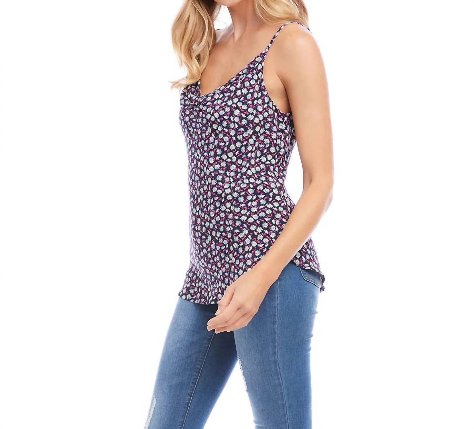 100% вискоза. Вырез-хомут определяет эту пышную майку с цветочным принтом из креповой ткани. Регулируемые бретели. На подкладке. Только сухая чистка. Сделано в США из импортной ткани