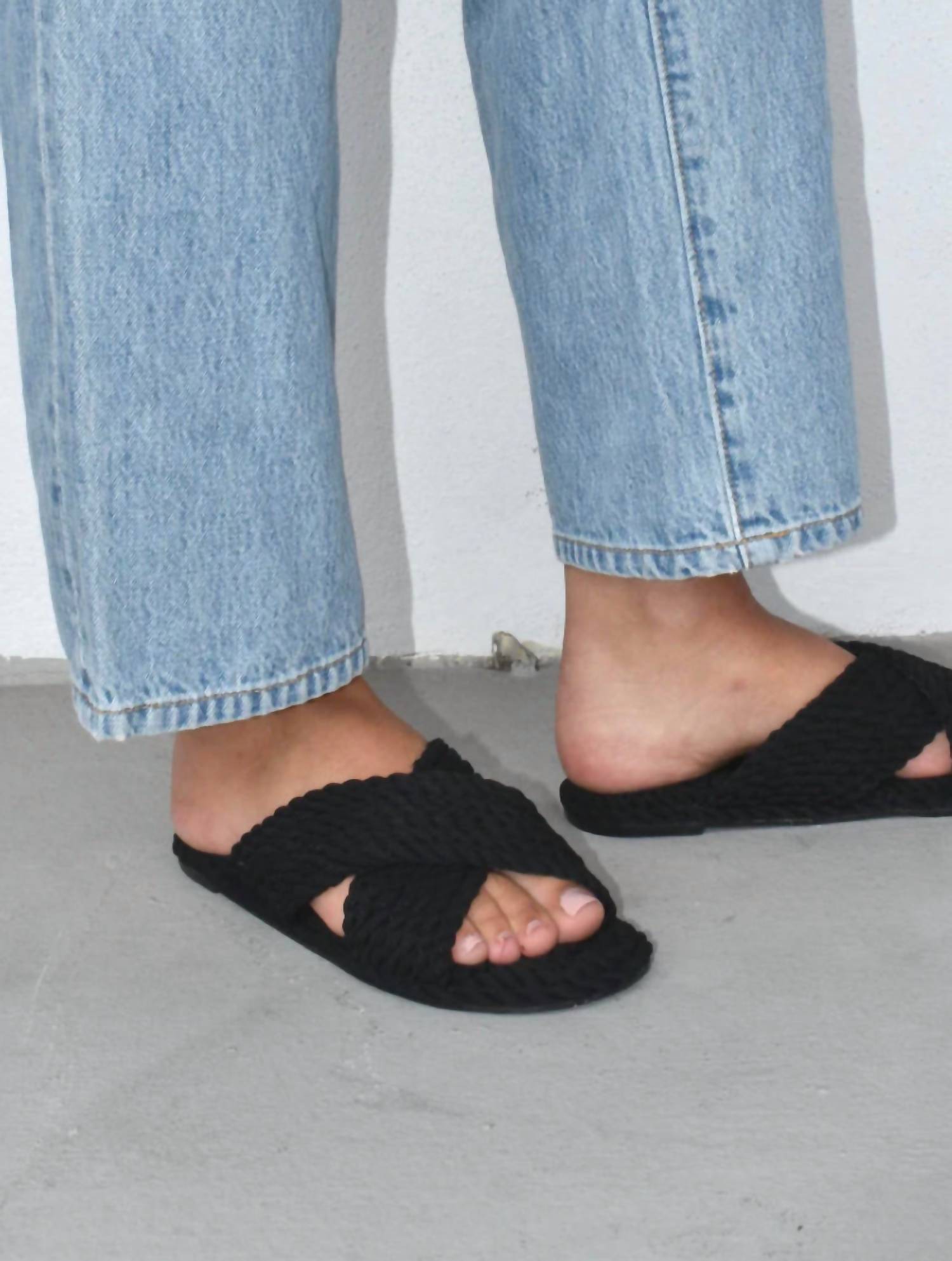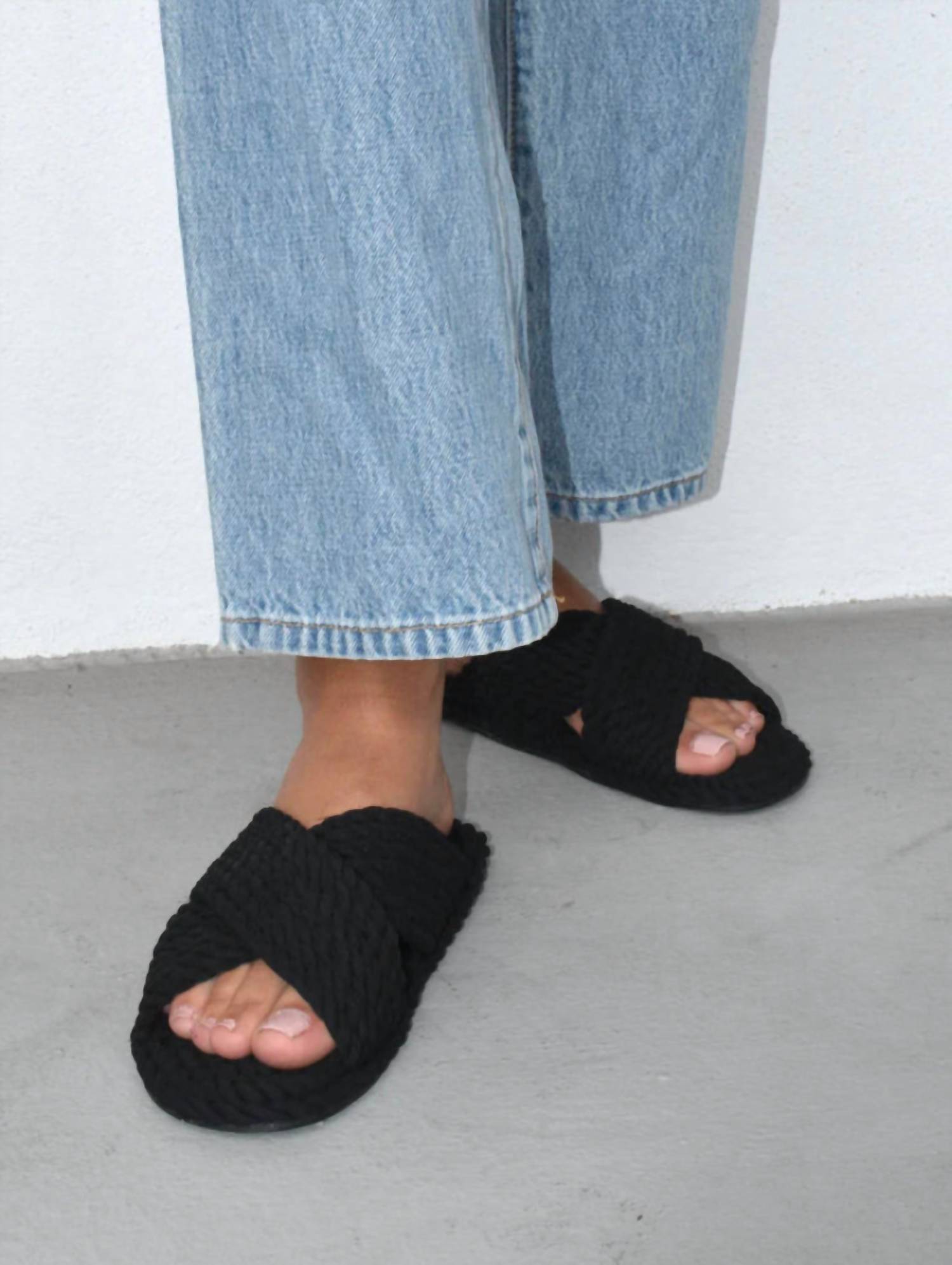 100% веганский канатный слайд, изготовленный из натуральной растительной ткани, сплетенный в канаты и вручную нанесенный для создания уникального сандалийного слайдера в шикарном черном цвете. Подошва изготовлена из прочного TPR. Посадка - Соответствует размеру. Верх - Ткань. Подкладка - Веганский ПУ. Стелька - Ткань. Подошва - Резина. Этично изготовлено вручную в Индии с использованием устойчивых бизнес- и производственных процессов.