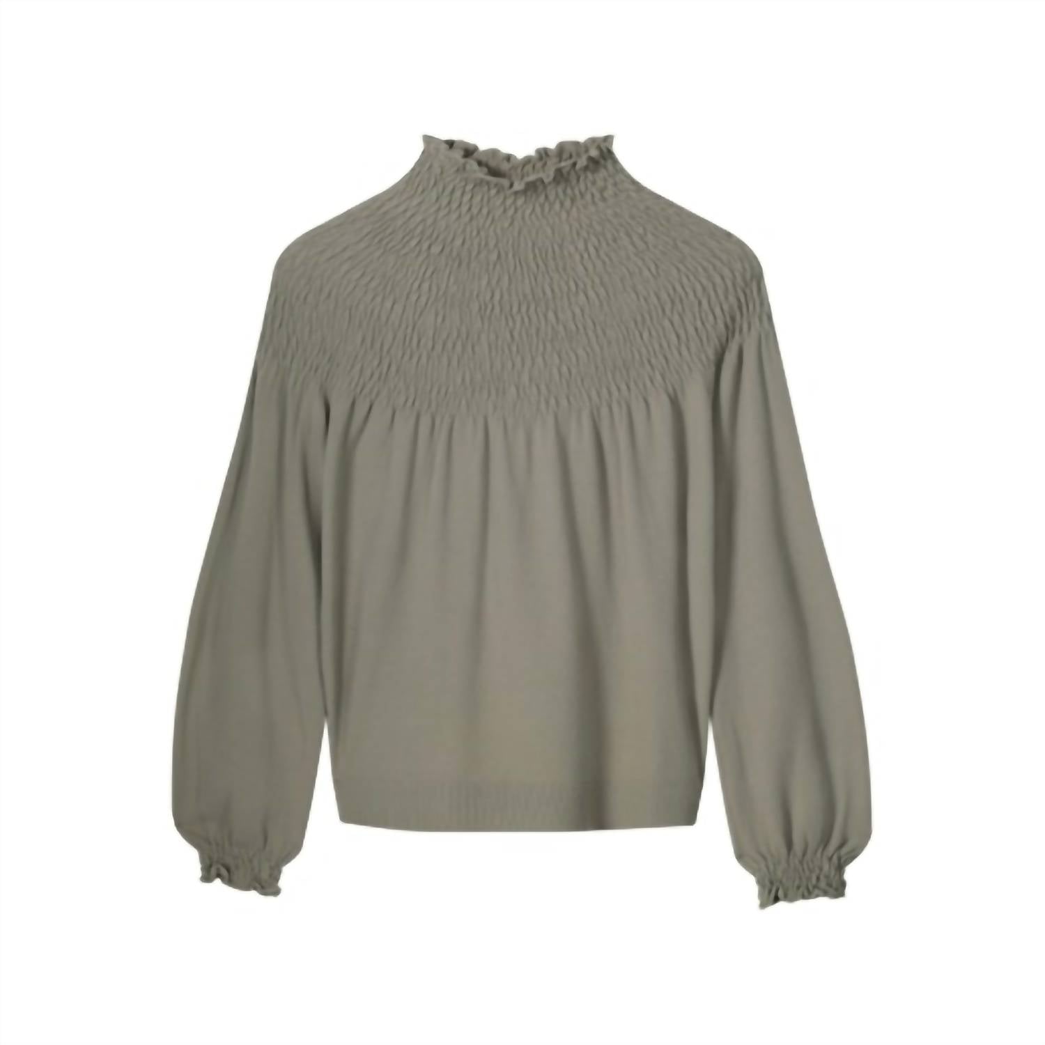 Мягкий тонкий трикотаж. Классический крой. Полностью присборенный от плеча до шеи. Воротник-стойка. Длинные рукава с присборенным воротником. Ребристый низ. Ткань - 65% вискоза, 35% полиамид. Размер XS, длина от плеча 56 см.