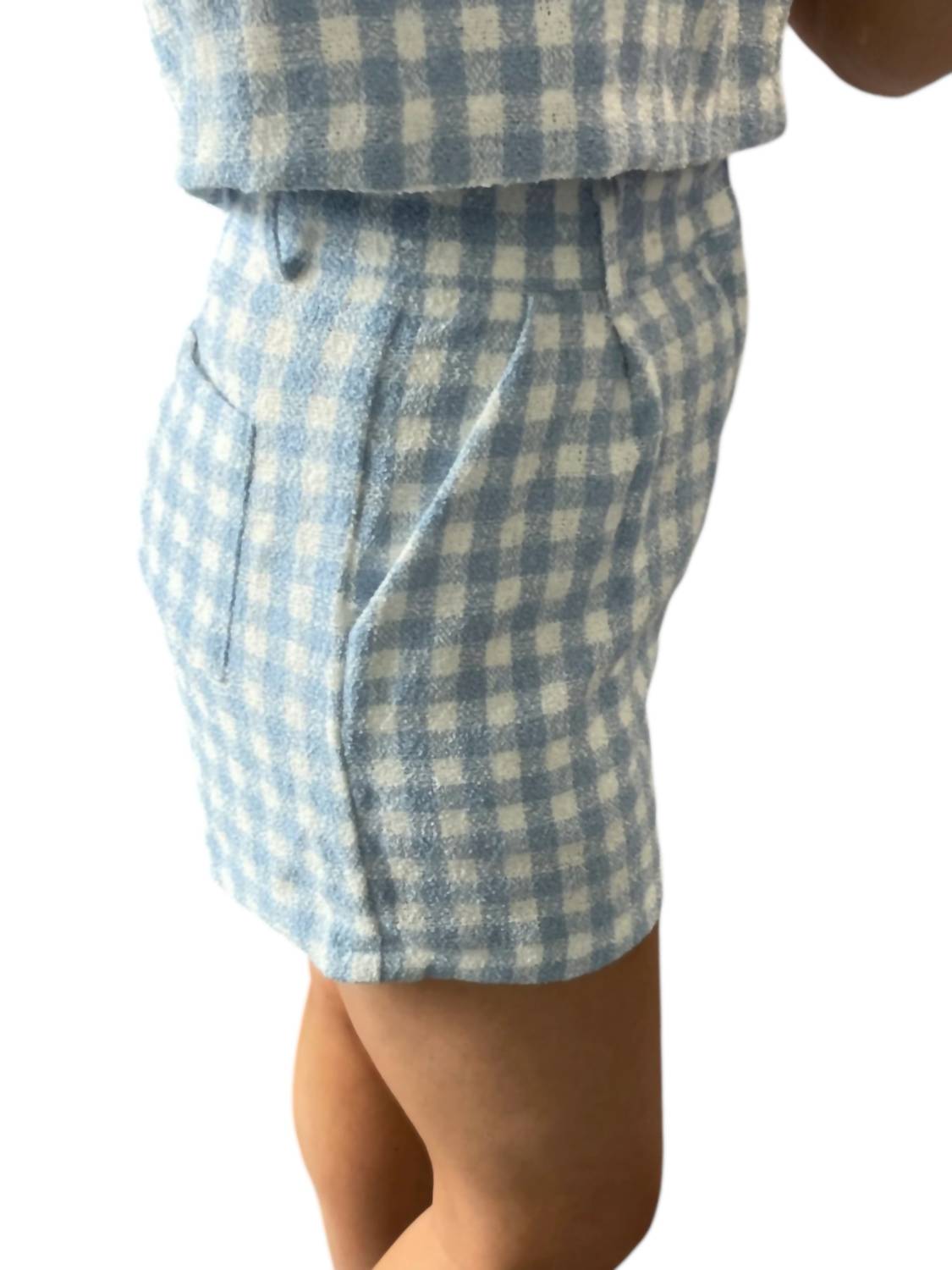Классические шорты с высокой талией имеют шикарный сине-белый клетчатый принт. Разработаны с практичными передними карманами, шлевками и складками. Обеспечивают как функциональность, так и стиль. Застегиваются на крючки и петли. Идут размер в размер.