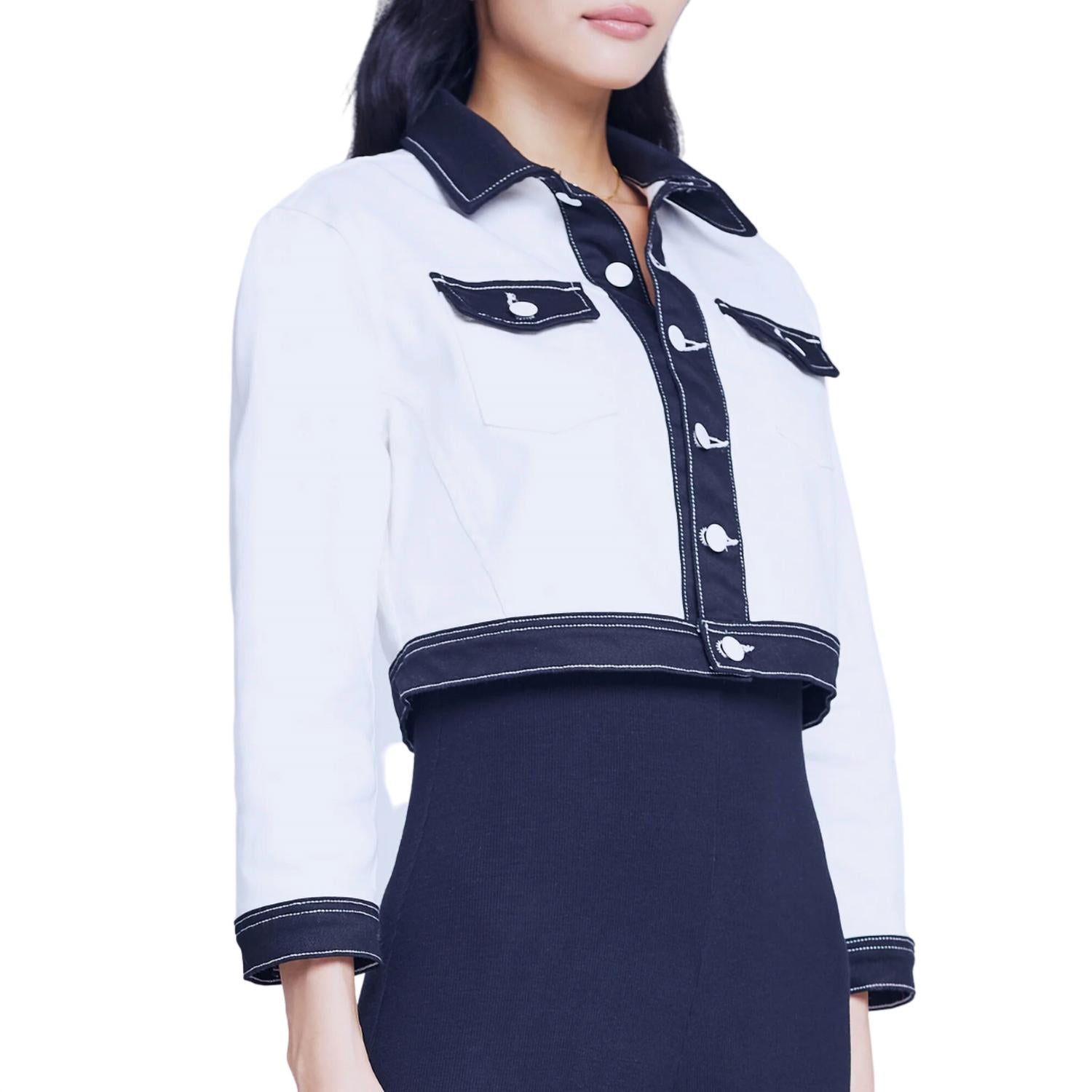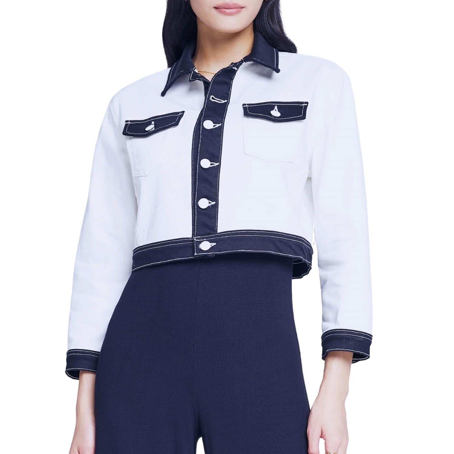 Милая, повседневная и удобная. Эта куртка просто необходима. Куртка L'Agence KodaХлопок, спандекс в белом/черном цветеУкороченная джинсовая курткаПремиум-стич деним спередиЗастежка на пуговицы белого цветаМанжеты на пуговицах три четвертиРукава с окантовкойКант сзадиКокетка с белыми и черными цветными блокамиНакладные карманы с клапанамиПриблизительная длина 17,5 дюймовДлина рукава 19,75 дюймовСделано в США
