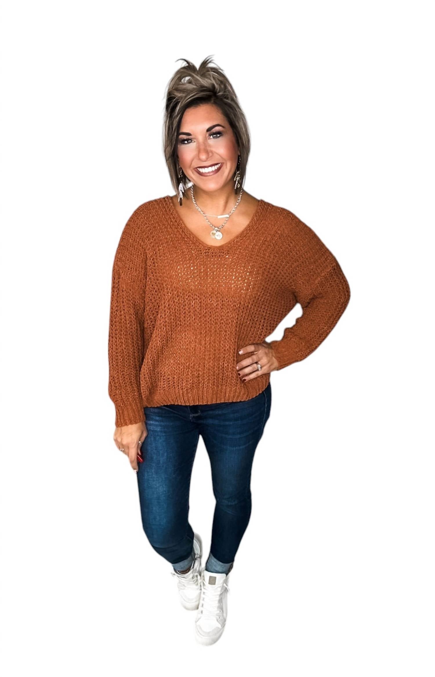 Этот свитер из толстой пряжи имеет V-образный вырез, длинные рукава и свободный крой. Это вязаный фасон надевания, состоящий из 55% акрила и 45% хлопка.