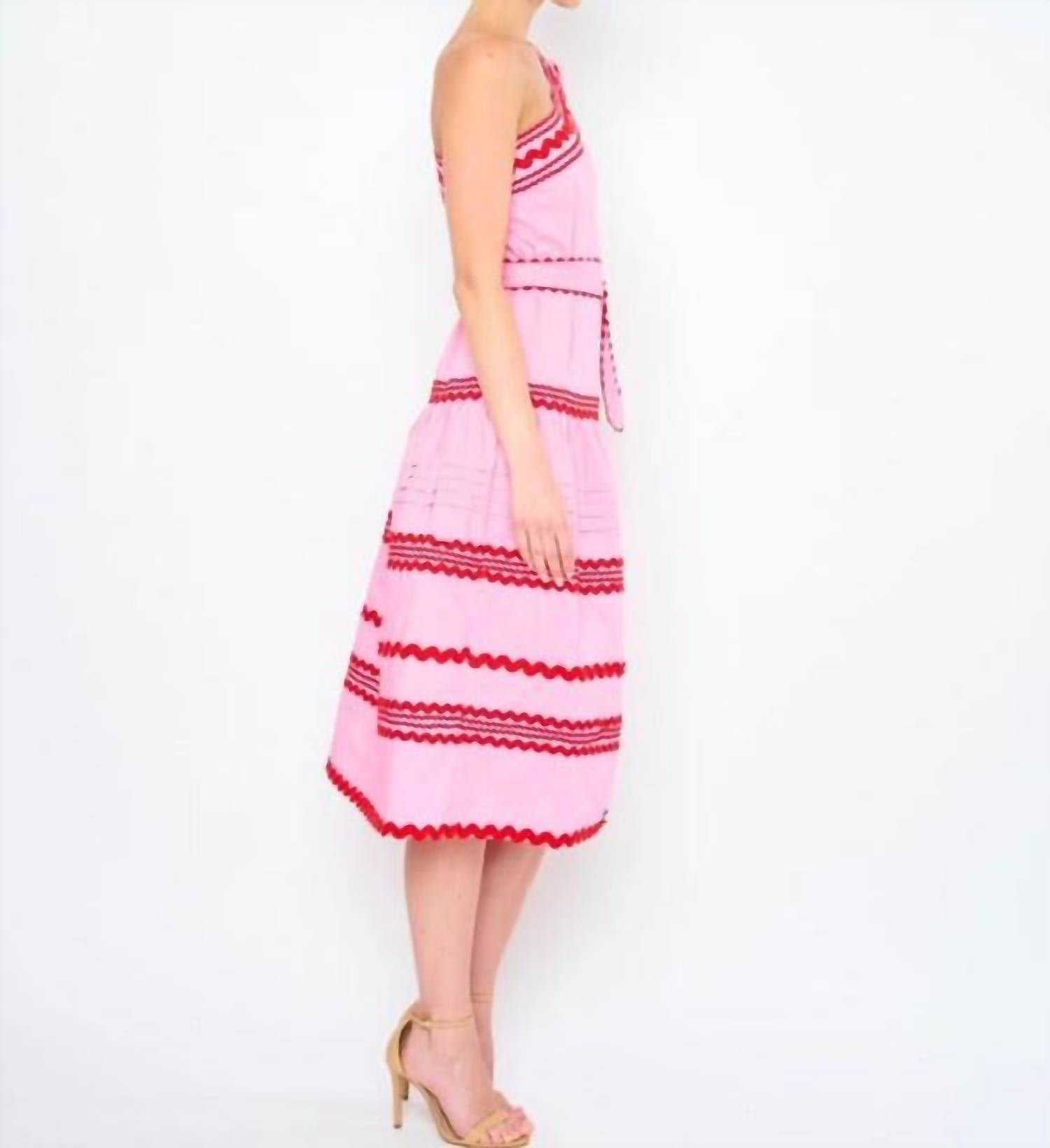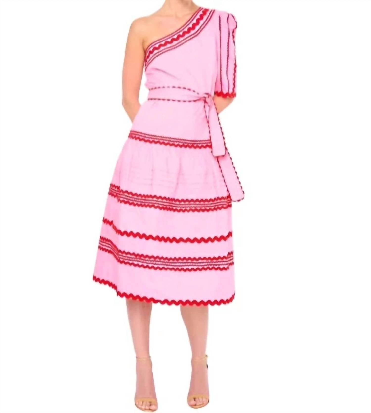 Платье Kerrin с открытыми плечами отличается дизайном с открытыми плечами и отделкой из красного рика и изготовлено из 100% хлопка. Оно включает в себя боковую молнию, пояс-завязку, рукава-фонарики длиной до локтя и карманы для практичности.