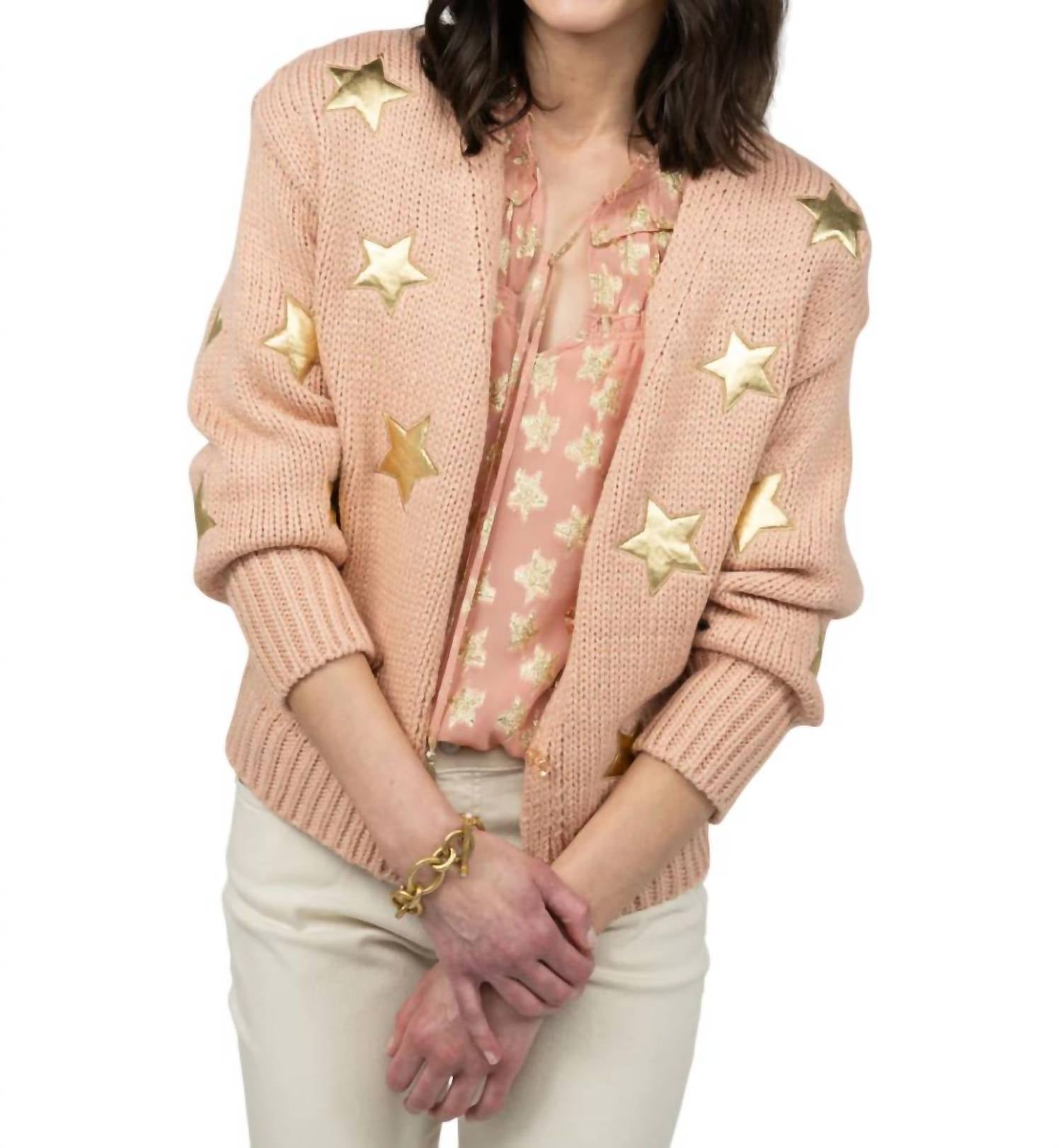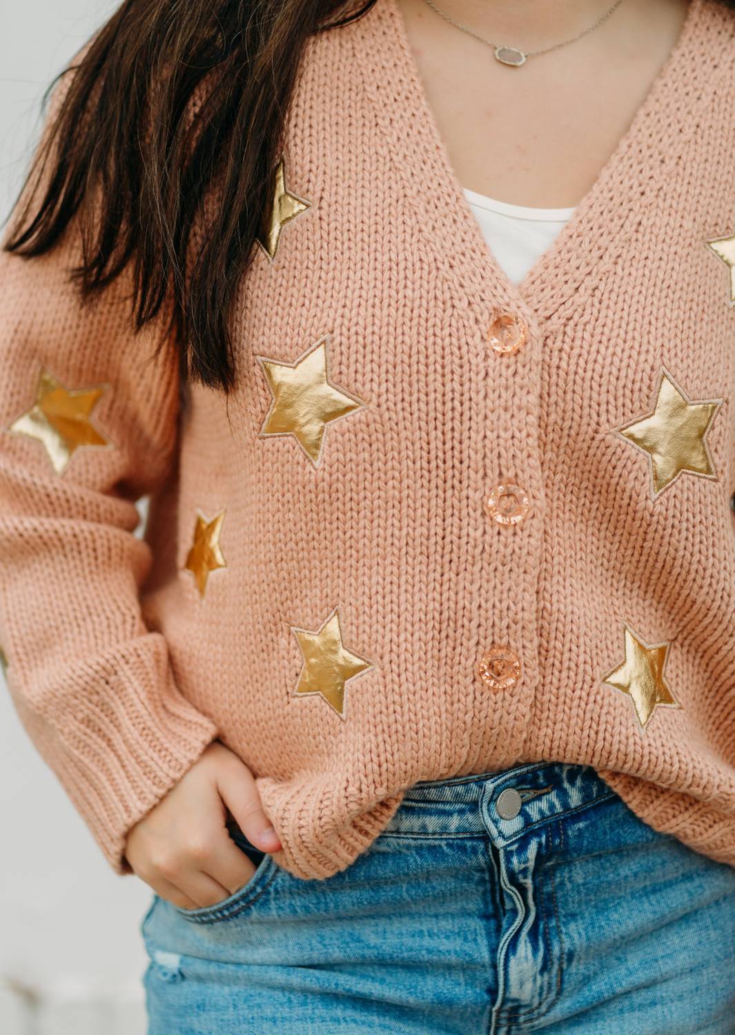 Кардиган Ivy Jane Gold Star — это кардиган на пуговицах цвета румян с искусственными хрустальными пуговицами и золотыми звездами. Он разработан для платья размера США 2-4, смоделирован на модели ростом 5 футов 9,5 дюймов, с бюстом 32 дюйма, талией 25 дюймов и бедрами 36 дюймов, номер модели 930043. Инструкции по уходу — только сухая чистка.