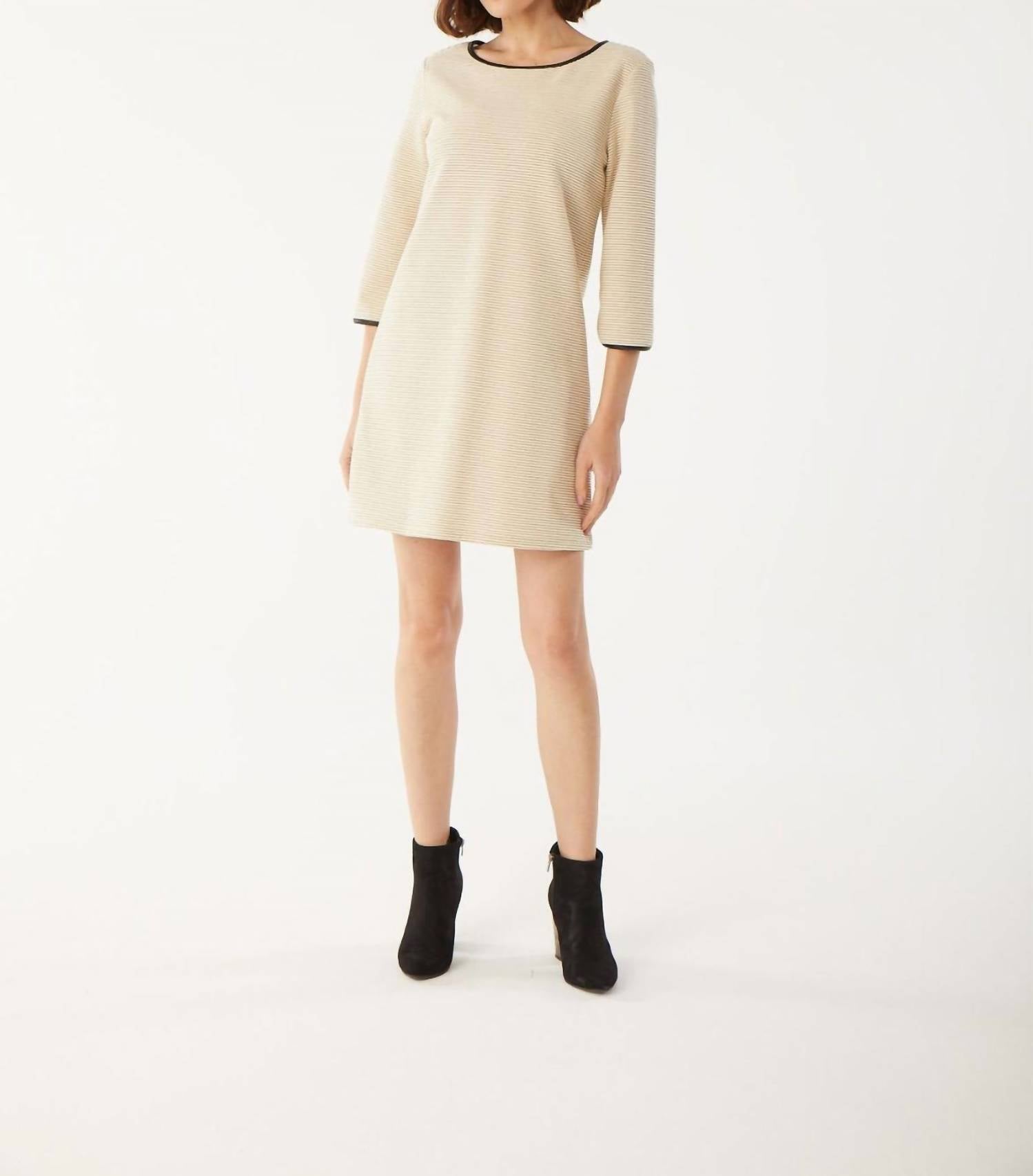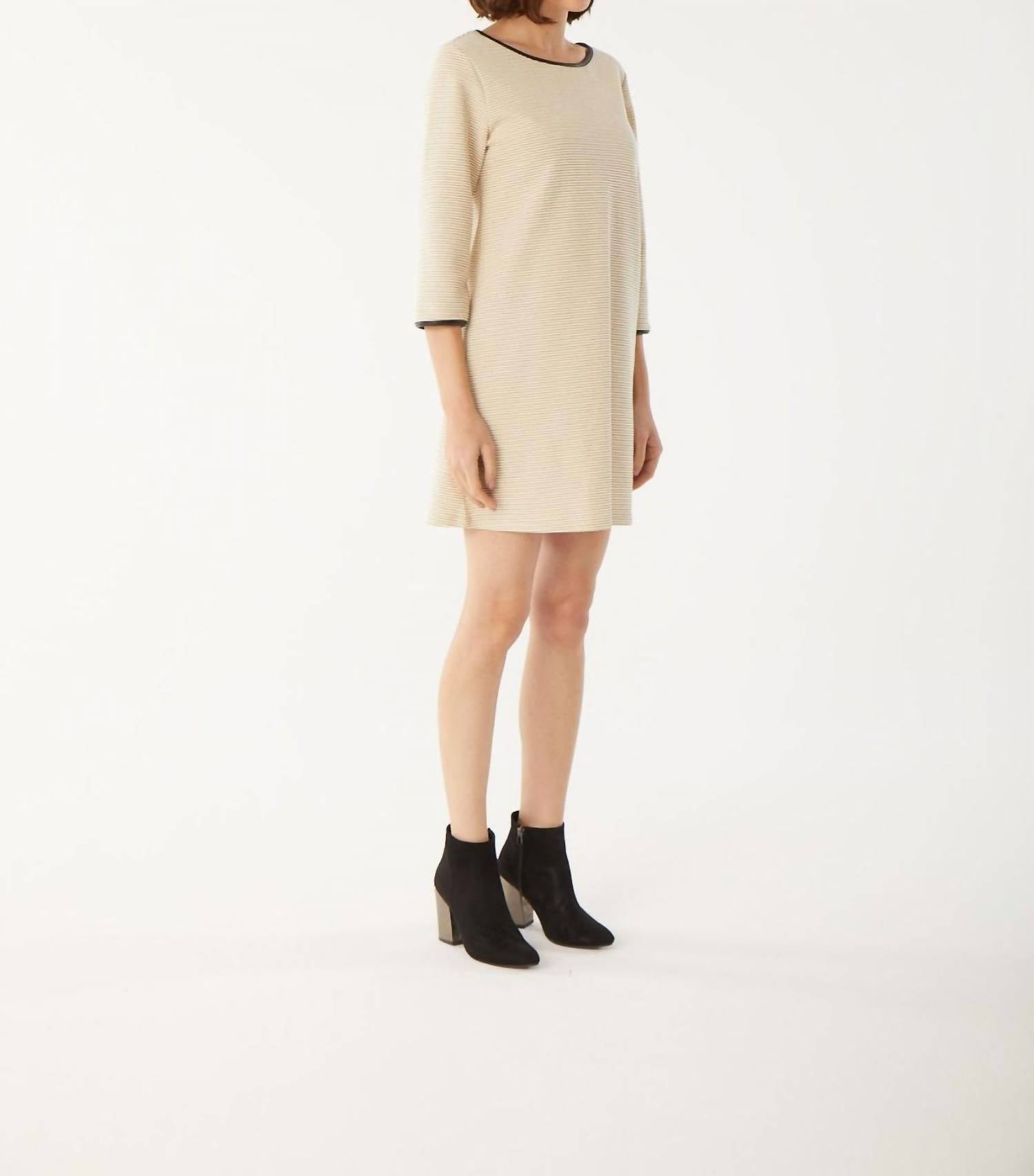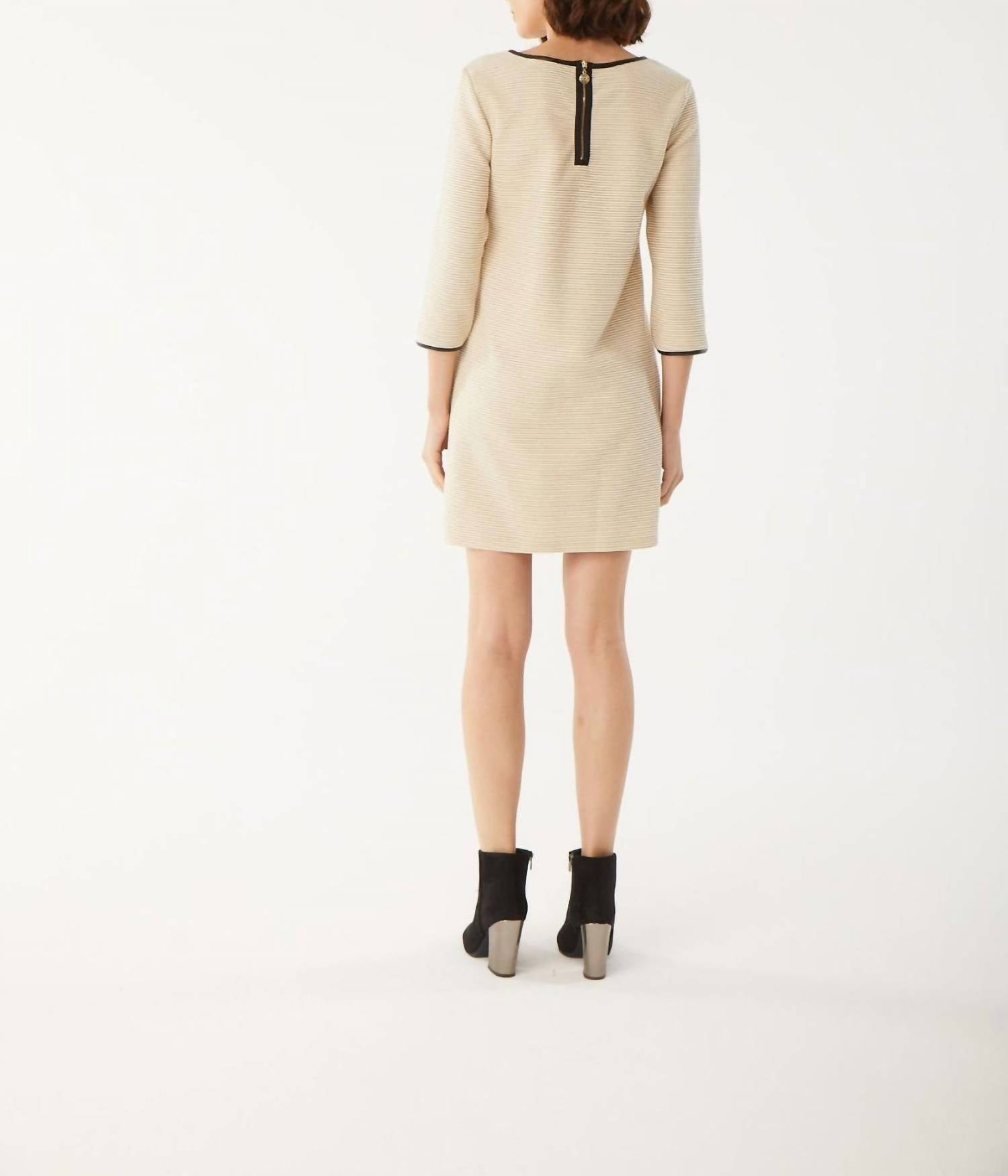 Шикарная и современная модель в однотонном кремовом оттенке. С рукавами три четверти. Стильный вырез-лодочка, украшенный деталями из черной искусственной кожи. Создает изысканный силуэт. Изготовлен из удобной смеси 75% хлопка, 20% полиэстера и 5% вискозы. Имеет практичную застежку-молнию сзади. Облегающий силуэт легко сочетает элегантность и функциональность.