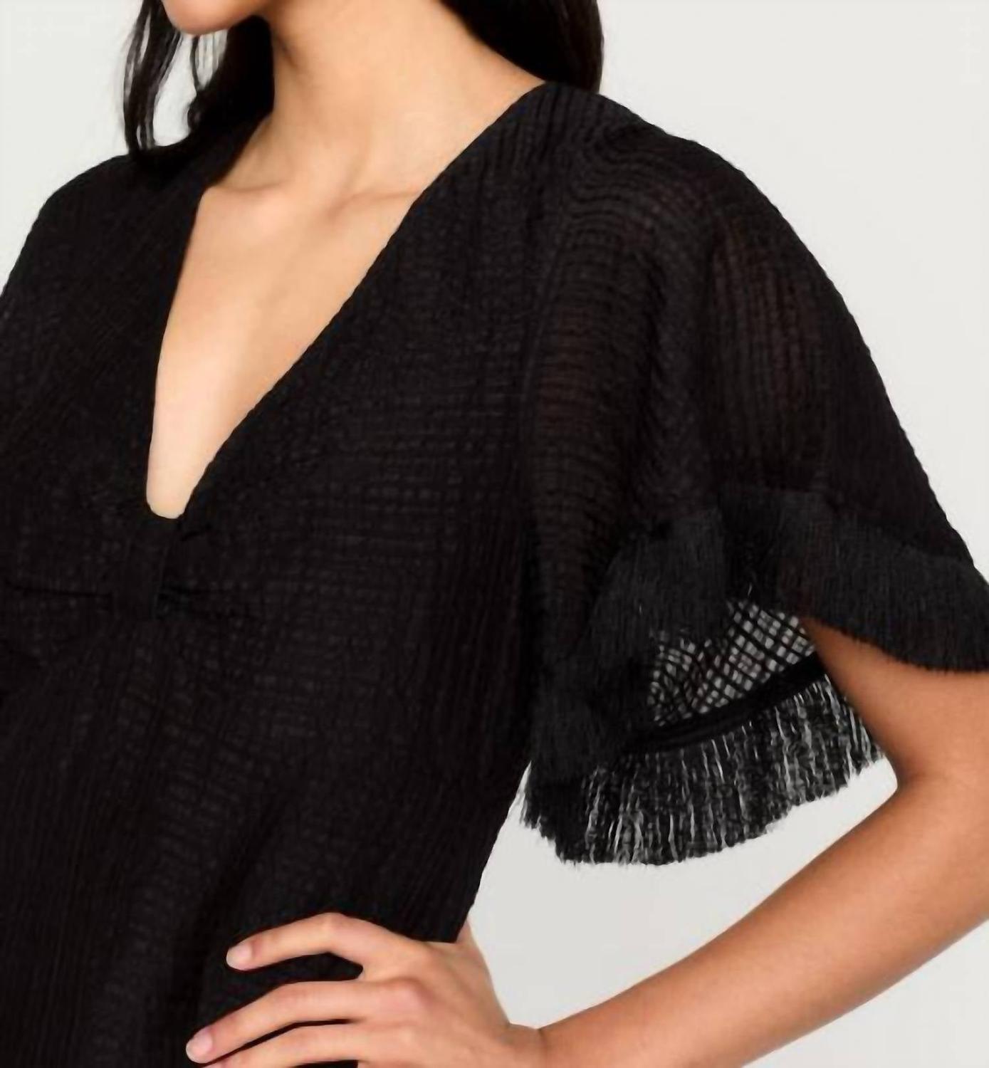 V-образный вырез. Короткие рукава с бахромой. Приталенный и расклешенный книзу крой. 56% вискозы, 44% льна. На подкладке. Соответствует размеру. Только химчистка.