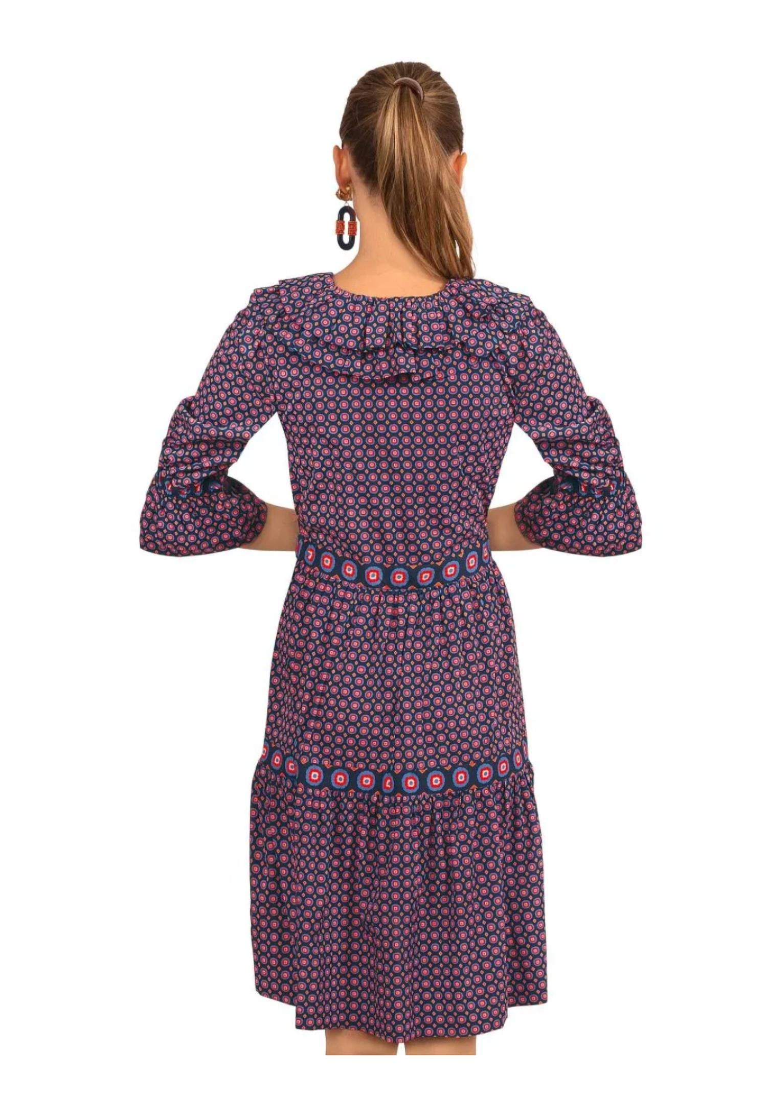 Длина 36 дюймов. Двойная оборка с фестонами. Рукава длиной до локтя заканчиваются эластичной двойной оборкой с фестонами. Двухъярусная юбка со сборками. Скрытые эластичные вставки по бокам на талии. Карманы в боковых швах. Полностью на подкладке. Контрастная внутренняя часть спинки. 100% полиэстер. Ручная стирка в холодной воде или бережный режим в холодной воде / сушка на открытом воздухе или режим прохладного воздуха.