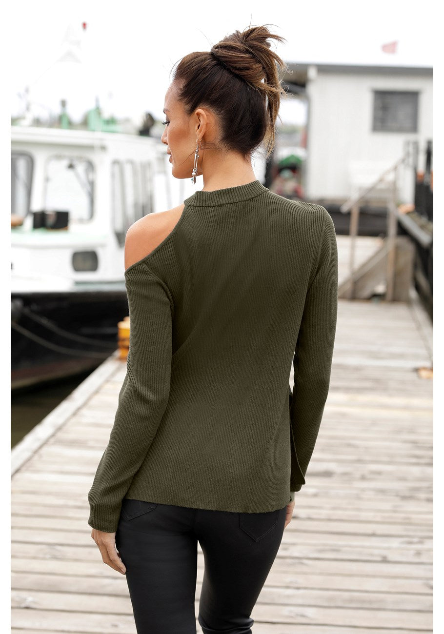 Свитер с длинными рукавами, круглым вырезом и вырезом на плече.