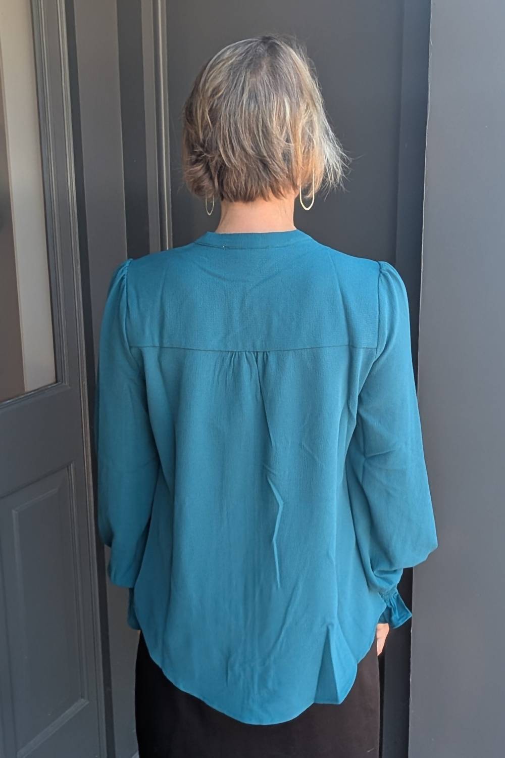 Рукава-присборки и свободный крой. V-образный вырез. Складки. Изогнутый подол. 95% полиэстер, 5% спандекс.