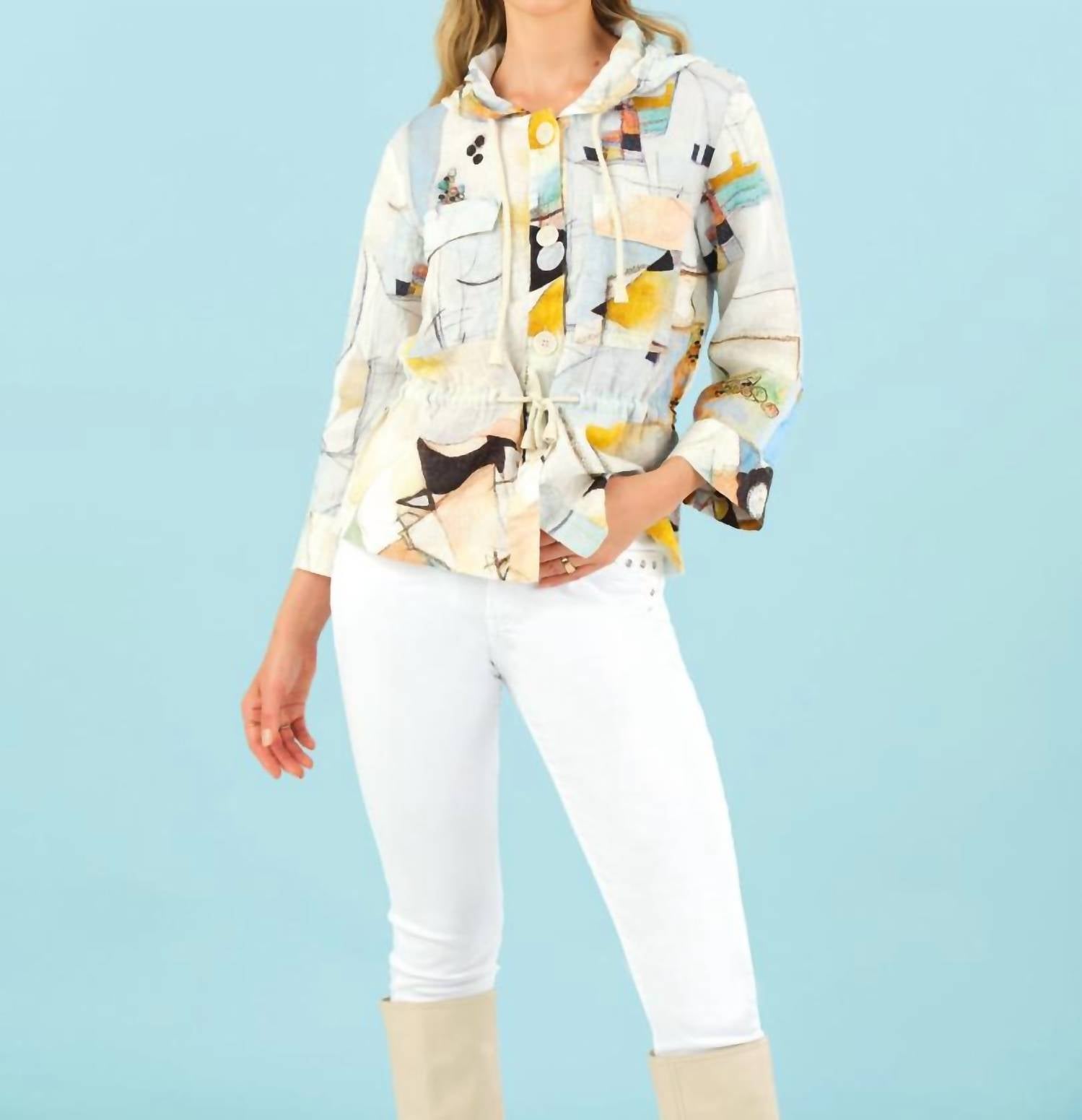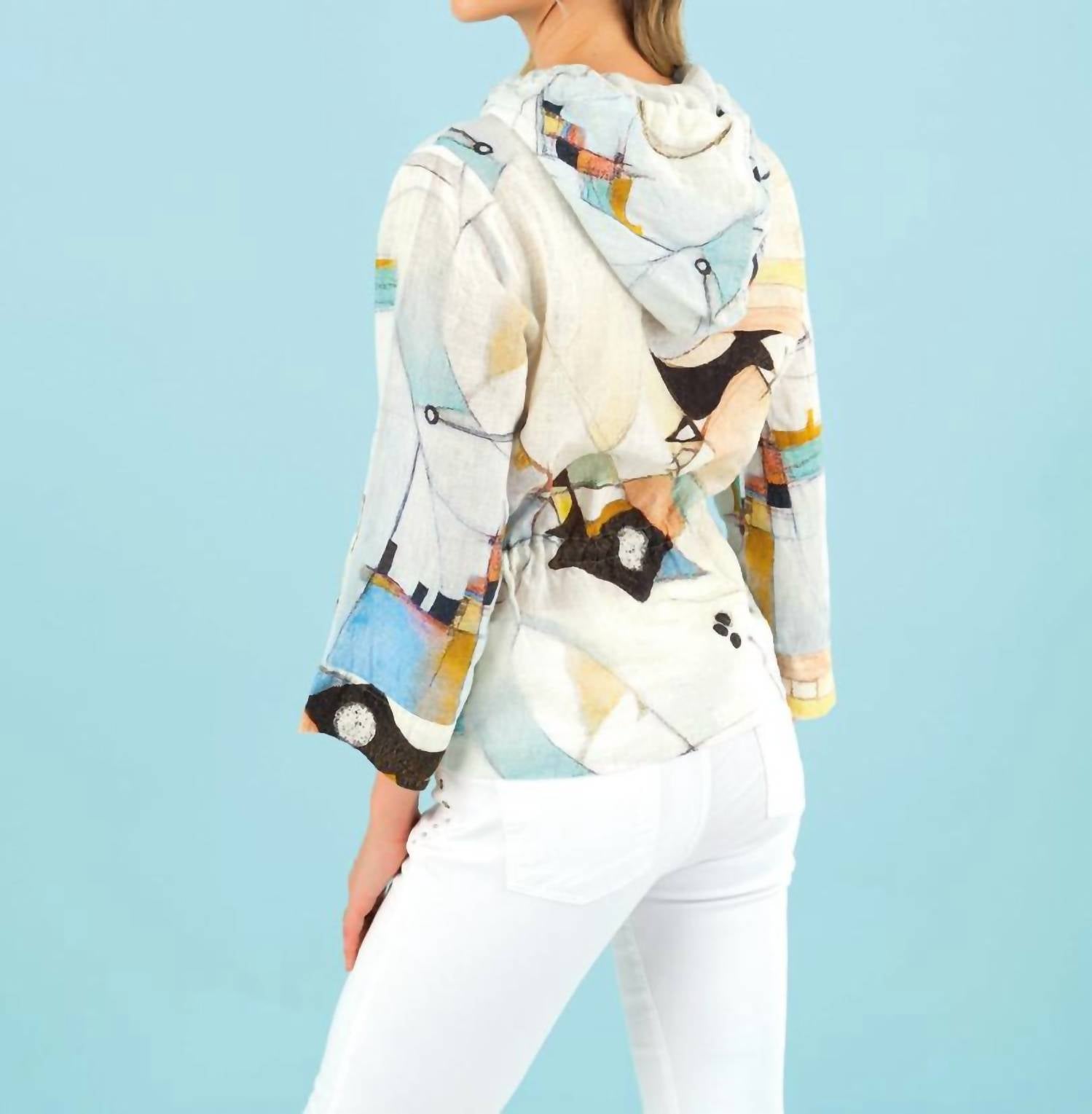 Художественный абстрактный дизайн картины Лори Деволт (из Массачусетса, США) в мягкой многоцветной палитре, капюшон с завязкой, карманы, застежка на пуговицы спереди, регулируемая талия, длинные рукава, свободная посадка. Ткань - 100% лен. Модель № 23663.