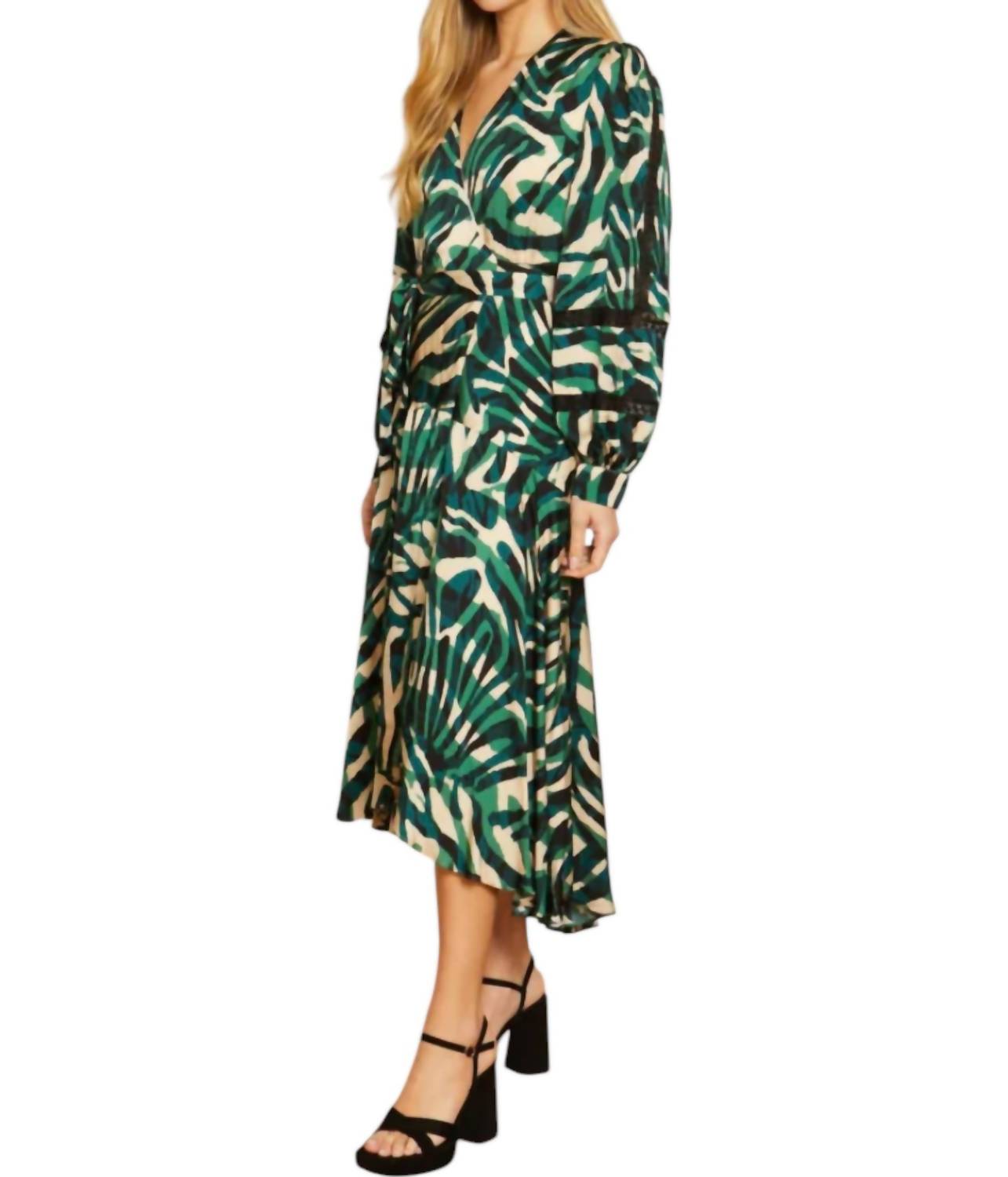 Элегантность и современный дизайн сочетаются с яркой эстетикой. Платье-обертка с длинными рукавами завораживает своим завораживающим принтом Rhythmic Zebra. Украшено изысканной кружевной отделкой вдоль рукавов. Изготовлено из 100% вискозы. Имеет завязывающийся пояс, который элегантно подчеркивает талию, создавая привлекательный силуэт. Длинный рукав с эластичными манжетами.