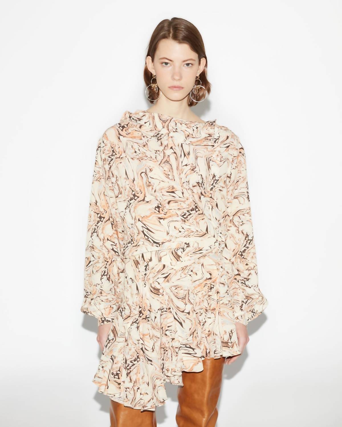 Высокий ворот с оборчатым воротником. Длинные рукава. Свободный, струящийся силуэт, длина до середины бедра. Ткань платья украшена абстрактным принтом в оттенках персикового, бежевого и черного на фоне кремового цвета. 100% шелк.