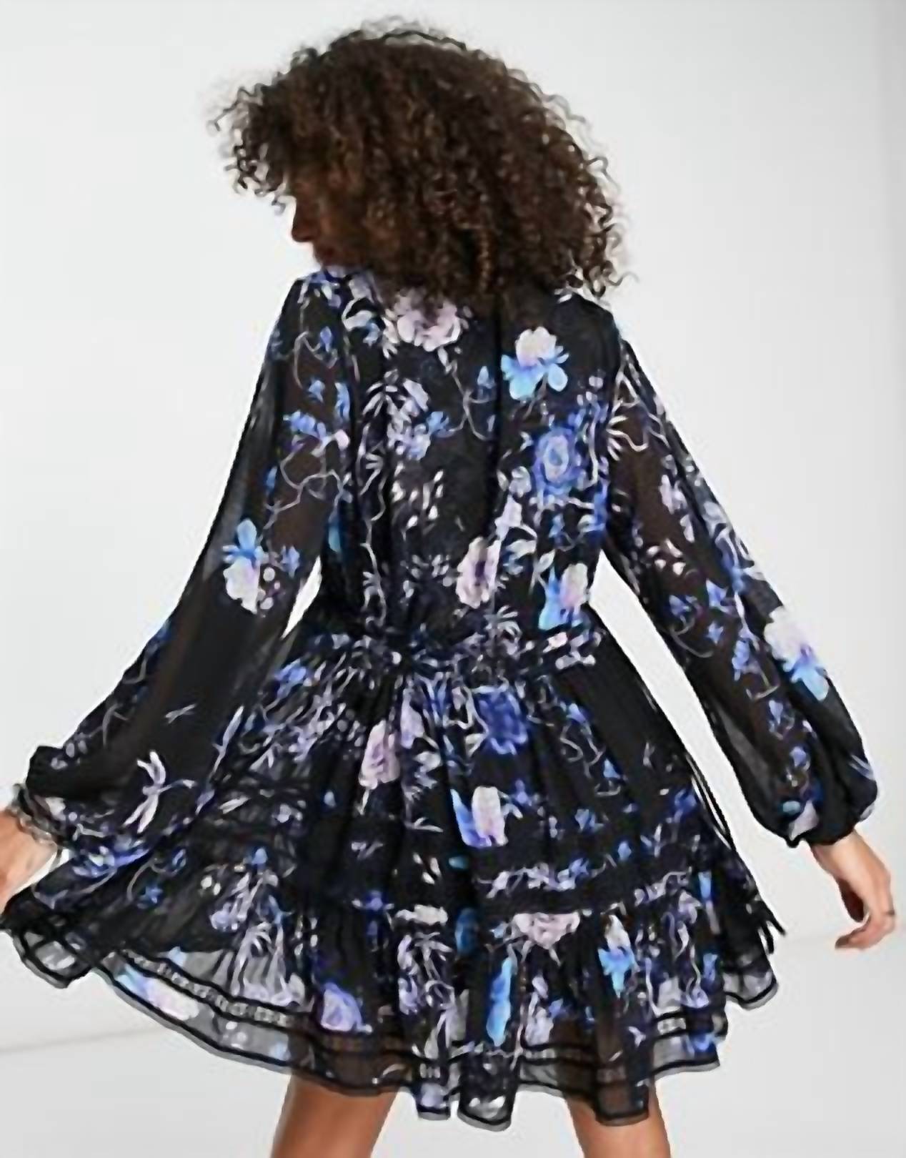 Женственность вне времени. Короткое платье с струящимся цветочным принтом. Глубокий V-образный вырез. Кружевная отделка. Талия на шнурке. Можно стирать в стиральной машине в холодной воде. 100% полиэстер.