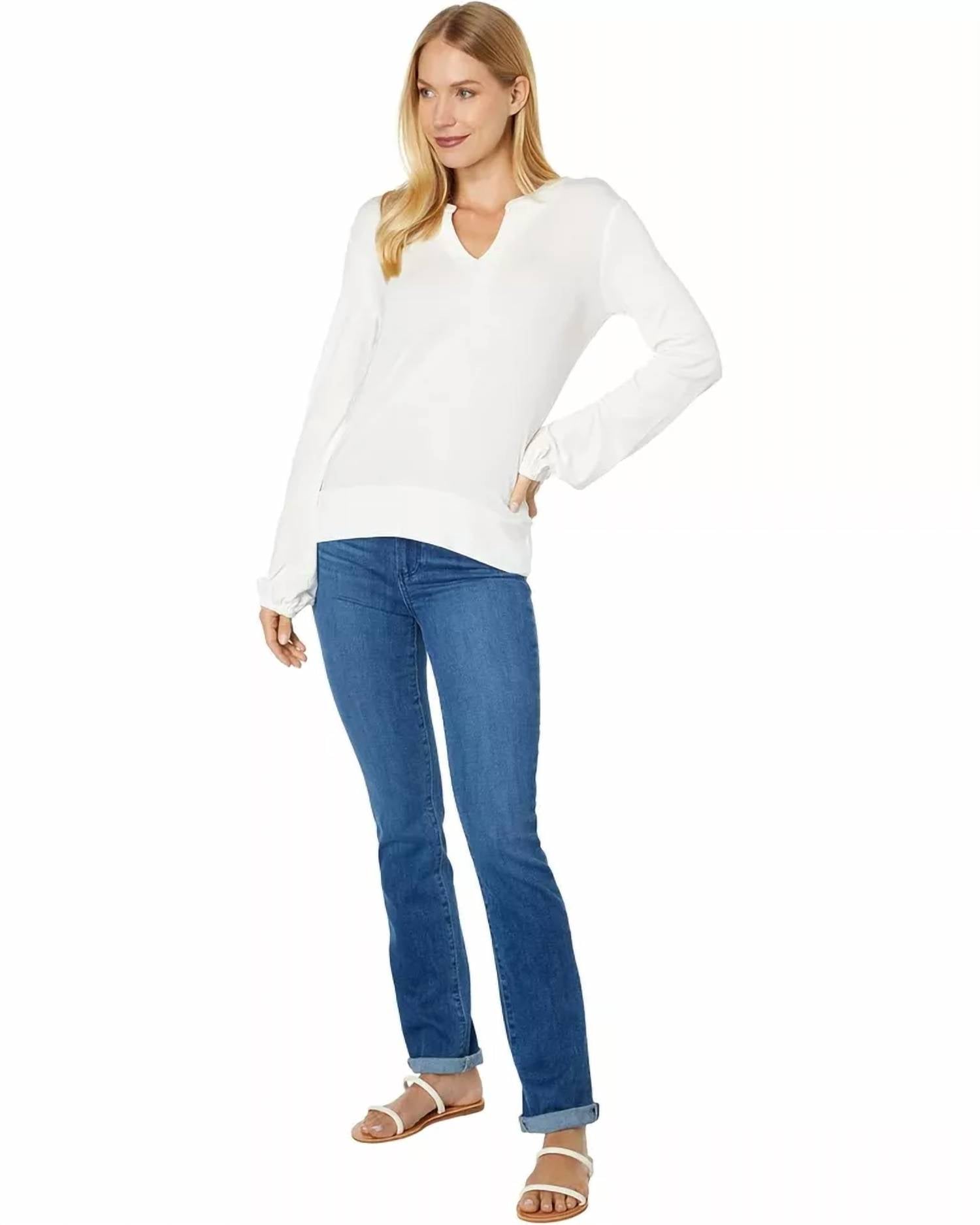 Трикотажная футболка. Рост модели 5 футов 9,5 дюймов, размер S. 90% вискоза, 10% спандекс. Машинная стирка в холодной воде, не отбеливать, сушить на горизонтальной поверхности, гладить при низкой температуре при необходимости или чистить в химчистке. Импортируется.
