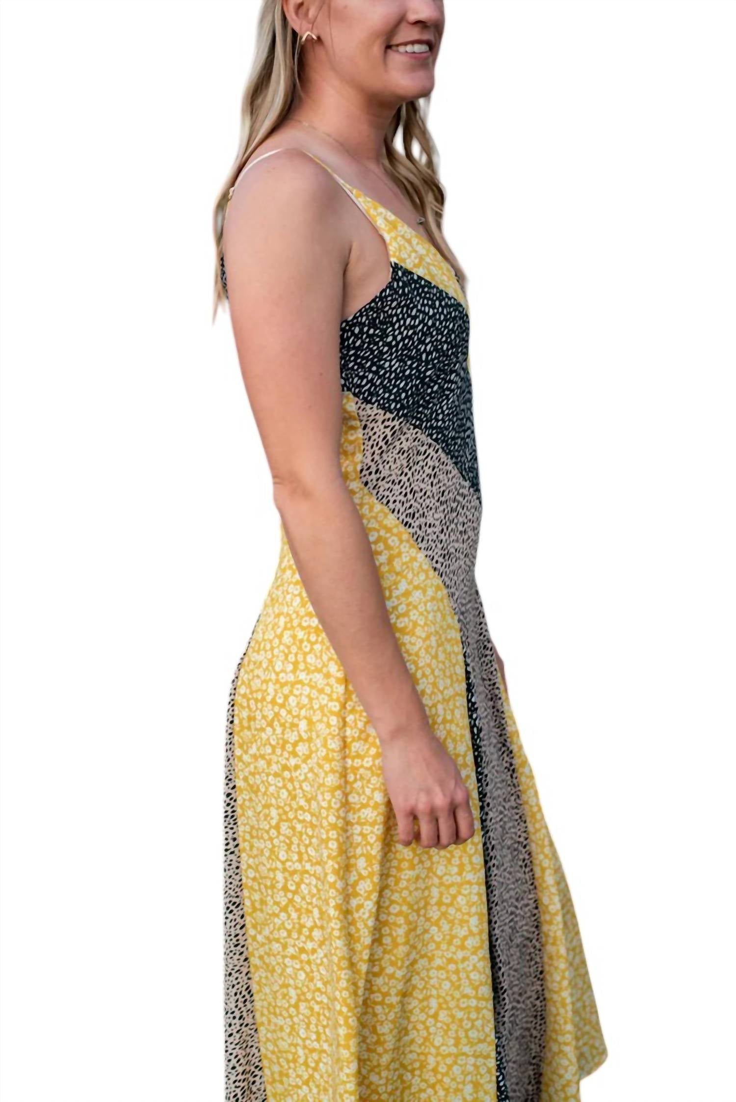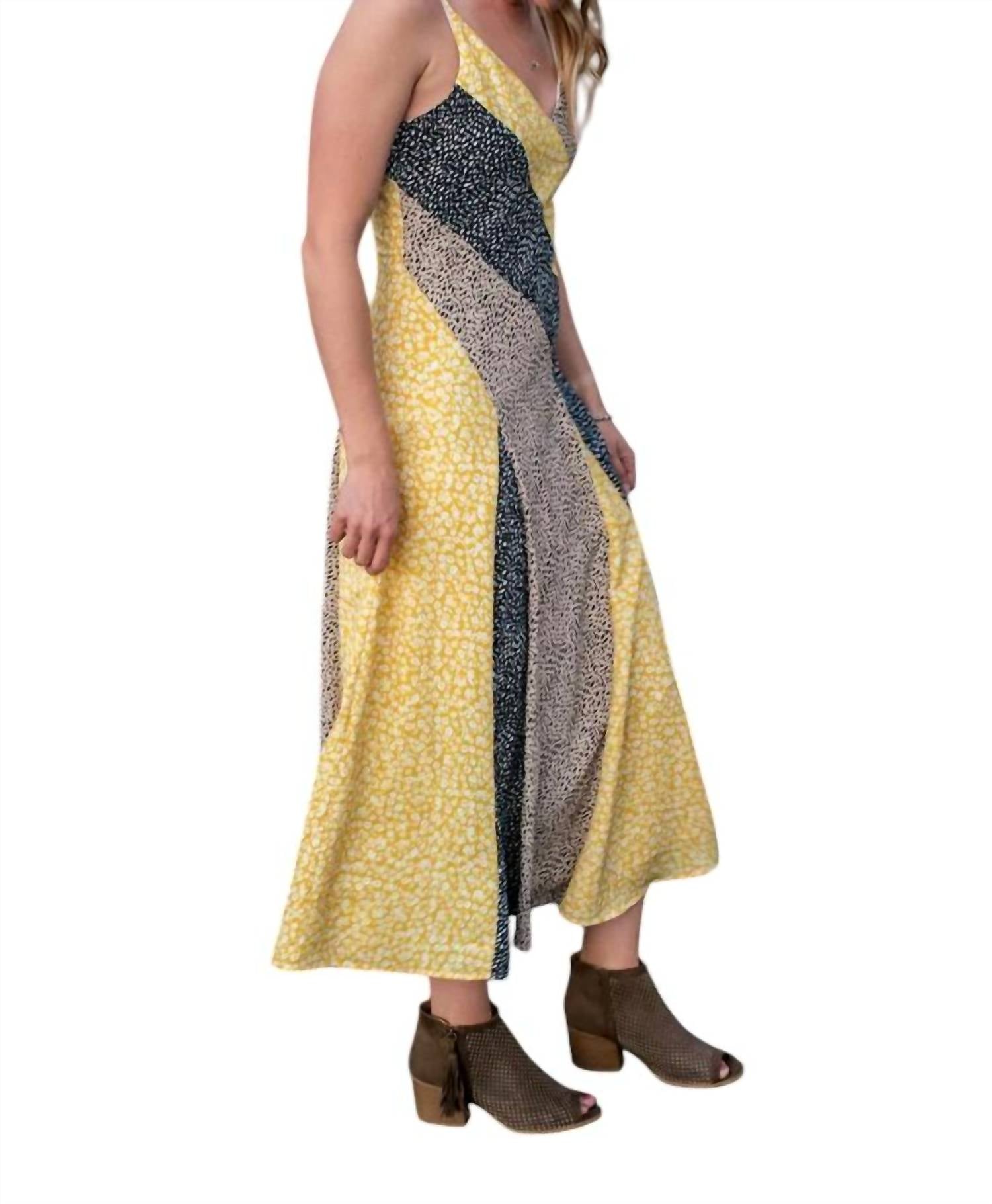 Это лоскутное платье миди отличается ярким сочетанием цветов в облегающем и расклешенном силуэте. Тонкие бретельки. Платье изготовлено из 100% полиэстера, подкладка из 95% полиэстера и 5% спандекса обеспечивает комфорт и посадку. Застежка-молния сзади. Это узорчатое изделие с V-образным вырезом соответствует размеру, идеально подходит для смелого модного заявления.