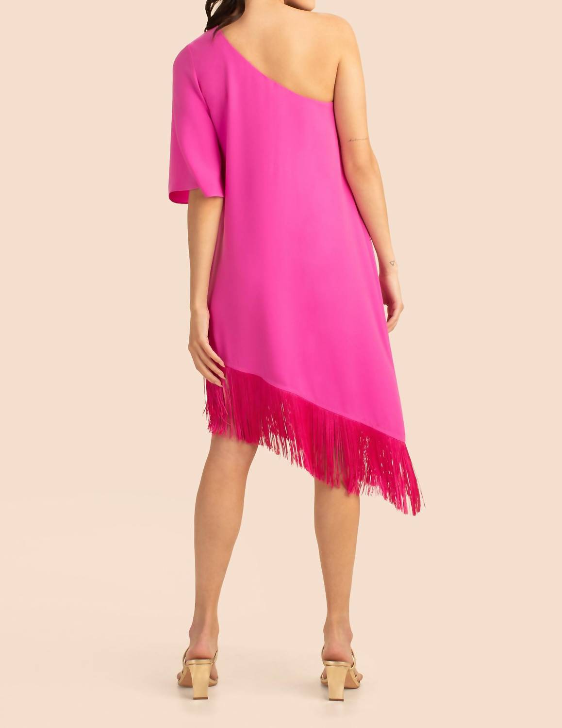 Вырез с открытыми плечами. Короткий рукав. Широкий А-силуэт. Асимметричный подол с бахромой. Рост модели 5 футов 10 дюймов, размер S. Шелковистый атласный креп сзади - ЭКО. 67% переработанного полиэстера, 33% полиэстера. Машинная или ручная стирка в холодной воде или химчистка. Ткань из Японии.