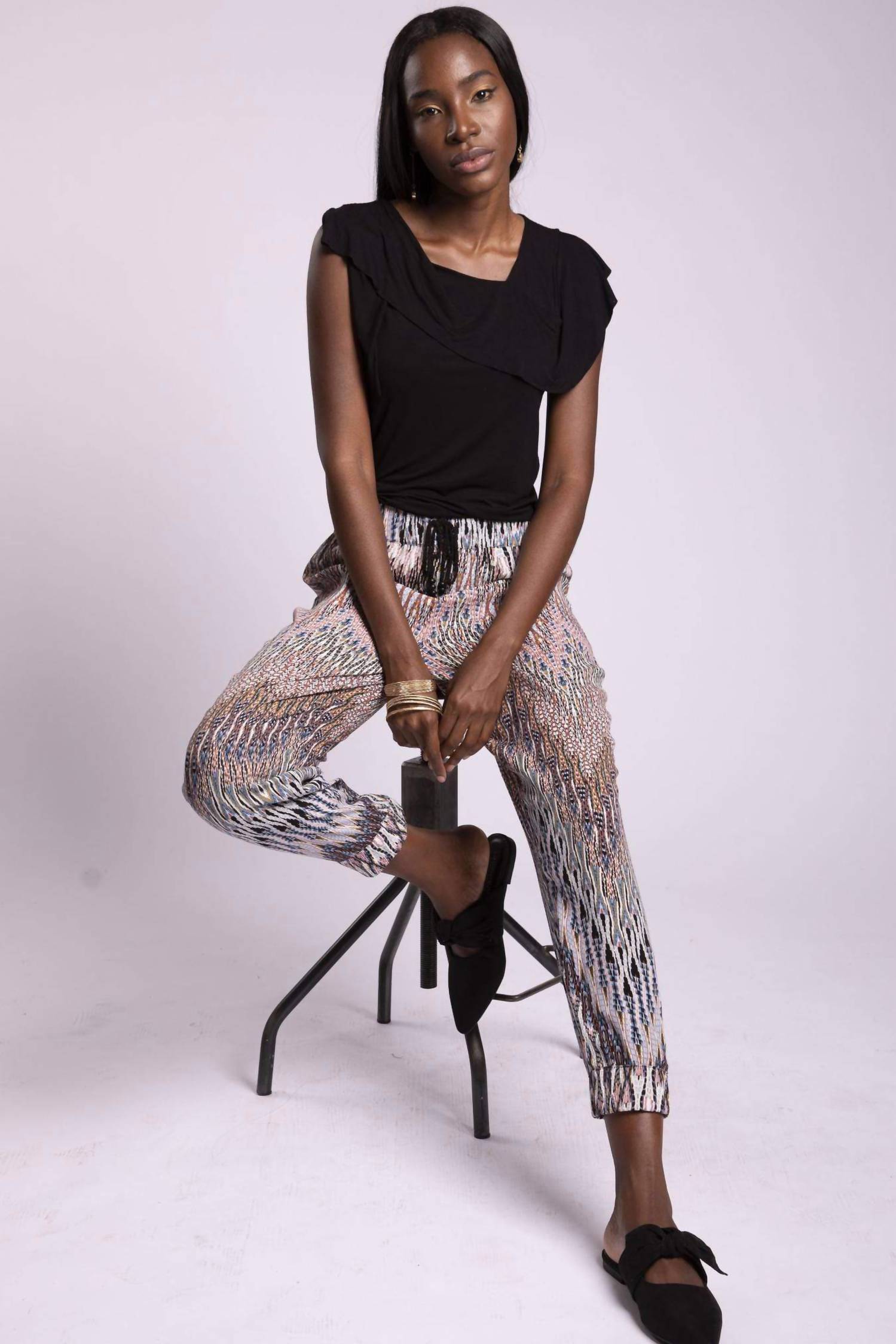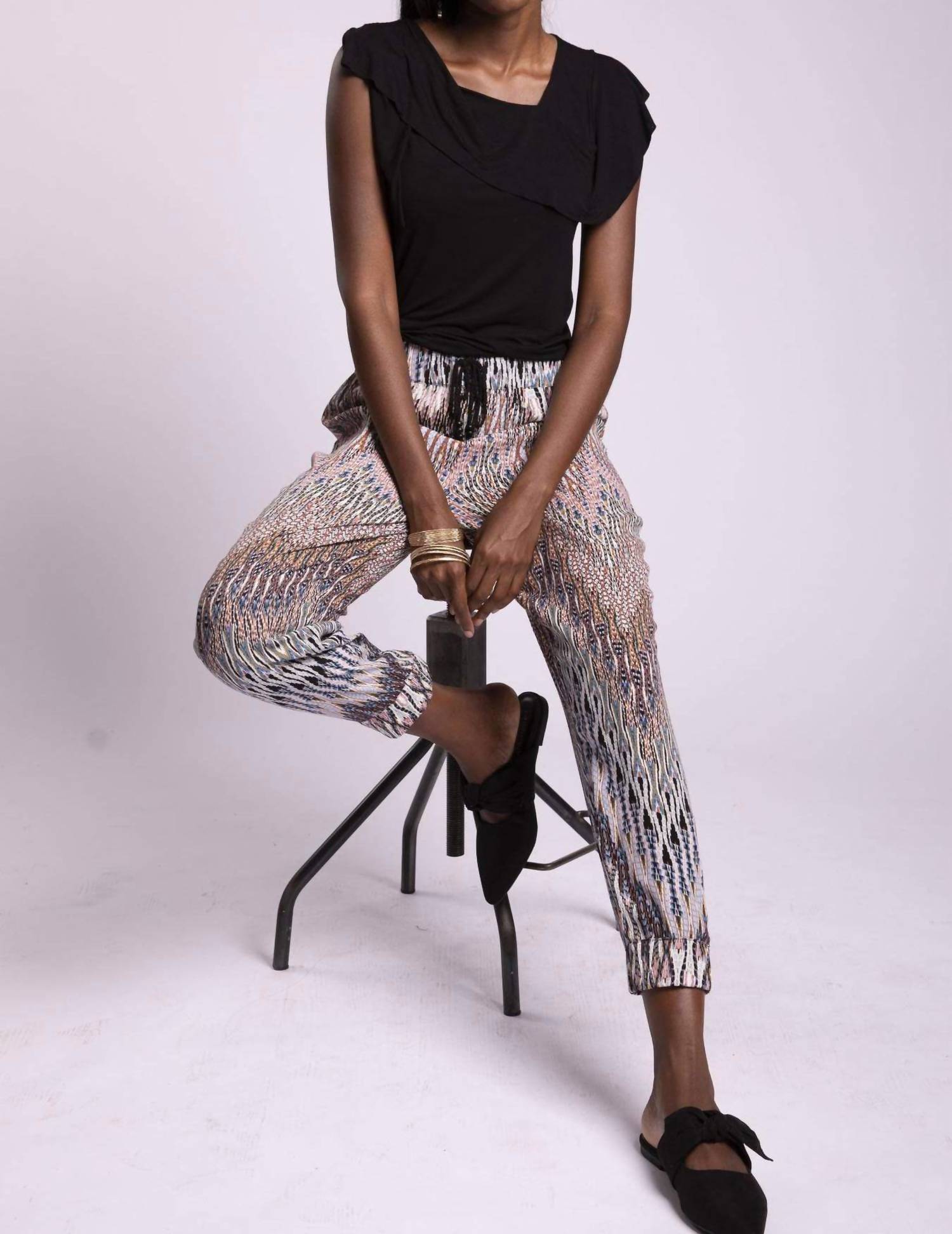 Этот мягкий и легкий узорчатый креп на ощупь шелковистый и гладкий. Разноцветный узор с огненными стежками привлекает внимание. Эластичный пояс с завязкой для удобства и легкости надевания. Сделано в США.