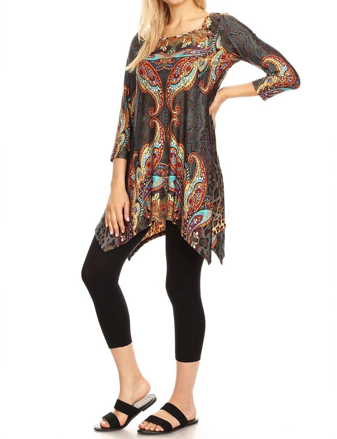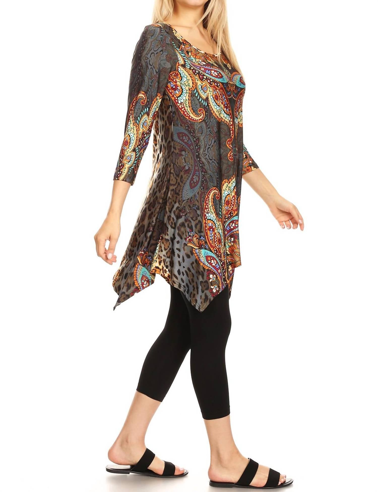 Эта облегающая туника от White Mark великолепно драпируется на вашем теле. Рукава 3/4, разноцветный узор пейсли и анималистичный принт, овальный вырез и два скрытых боковых кармана. Материал - 95% полиэстер и 5% спандекс.
