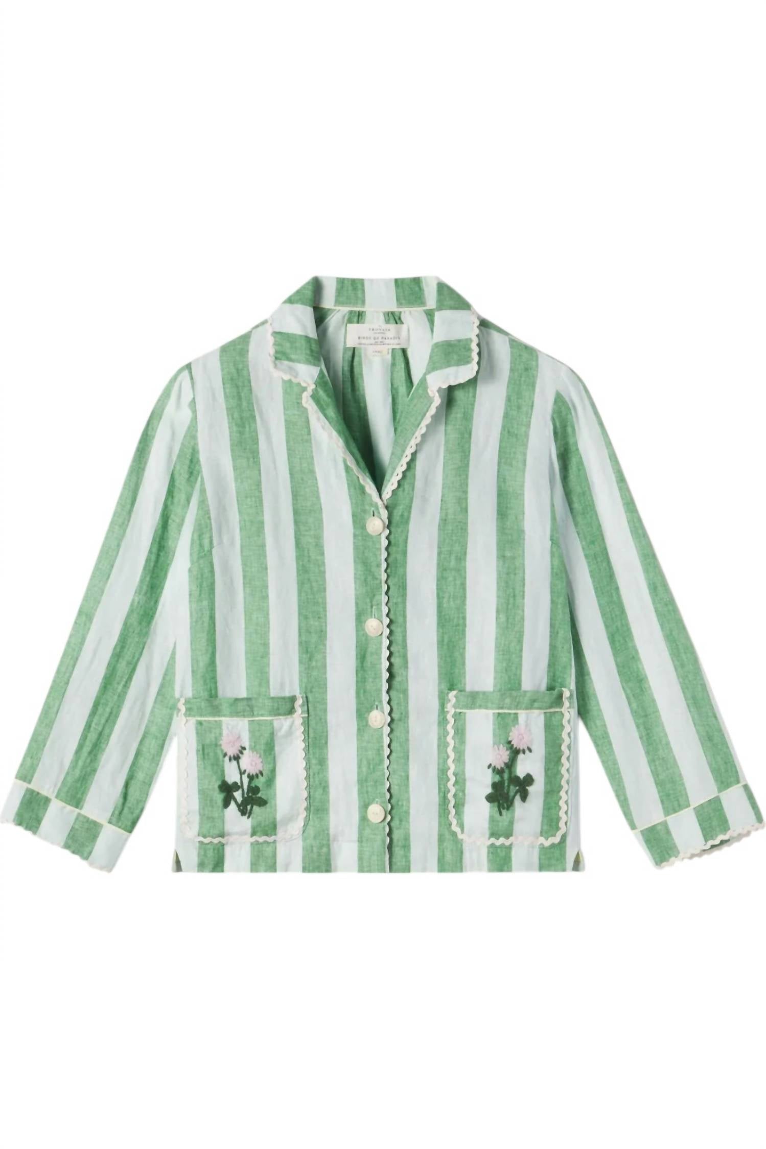 Универсальная вещь в шикарном дизайне Aloe Stripe. Длинные рукава, изготовлена из 100% льна. Рубашка на пуговицах с винтажной ручной вышивкой на передних карманах. Ребристая отделка по краям рукавов, швам карманов и передней планке. Антикварные белые пуговицы и зубчатый воротник завершают образ.
