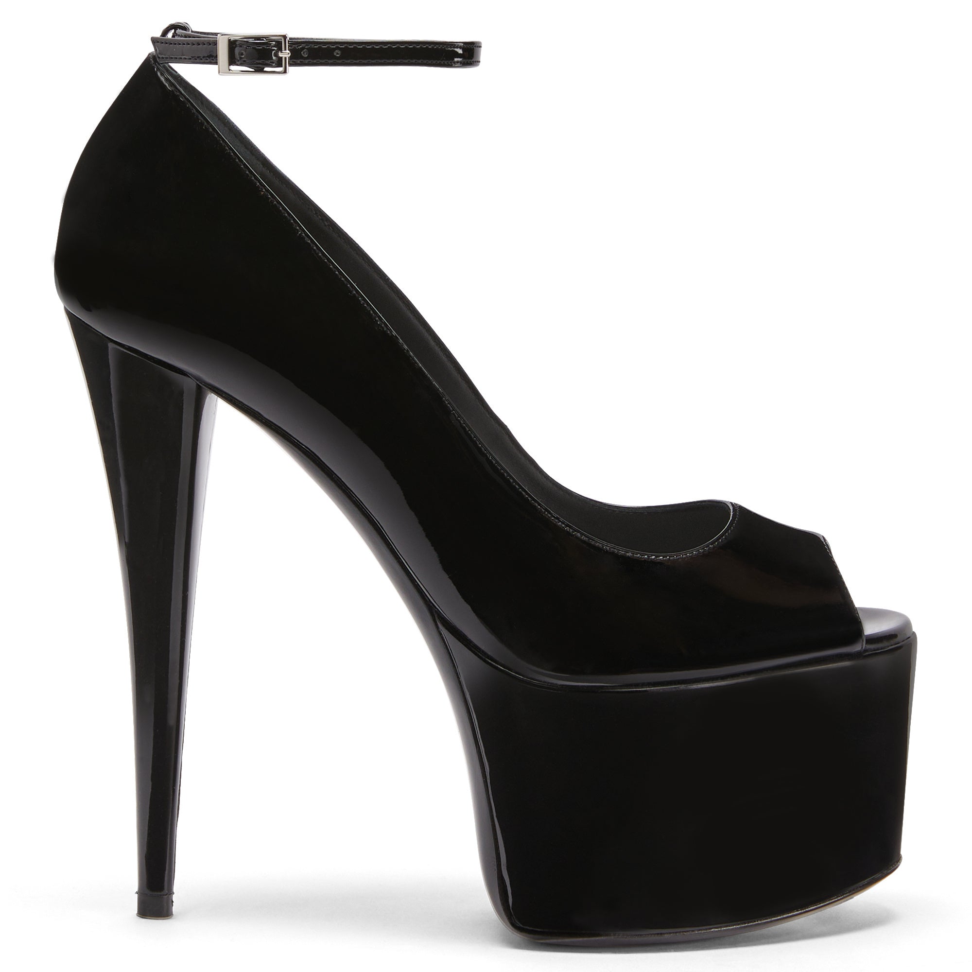 • Каблук высотой 150 мм, покрытый черной синтетической тканью с лаковым эффектом
