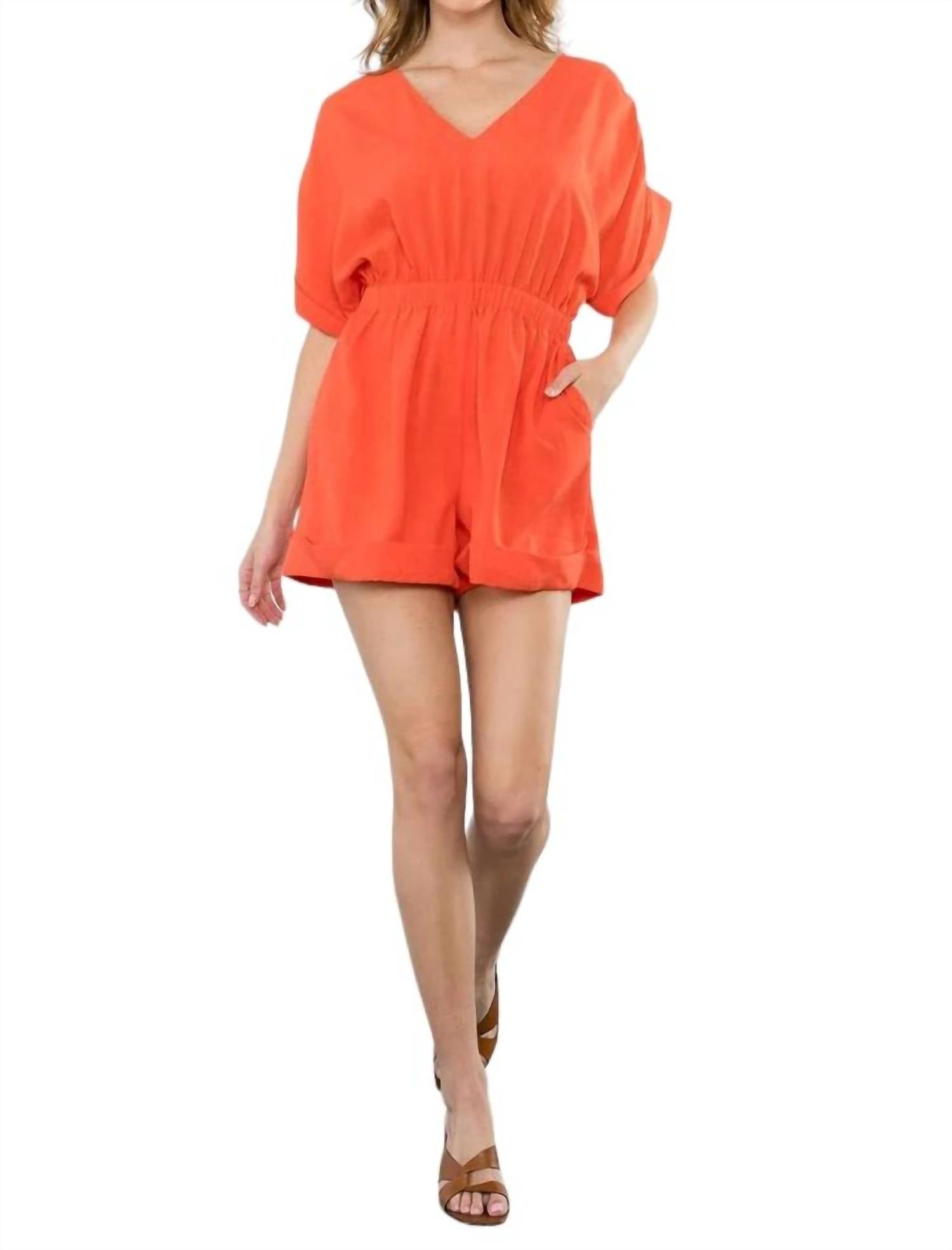 Jude короткий рукав, шорты с манжетами, комбинезон с v-образным вырезом. Материал - тканый, 100% полиэстер. Бюст Талия Бедра X-Small 34" 24" 42" Small 38" 26" 44" Medium 40" 28" 23"