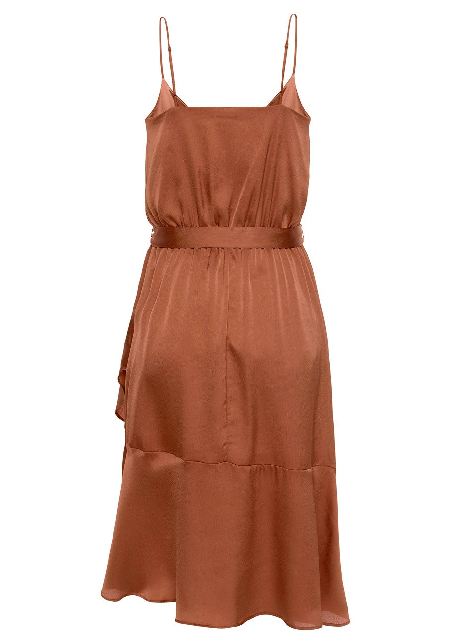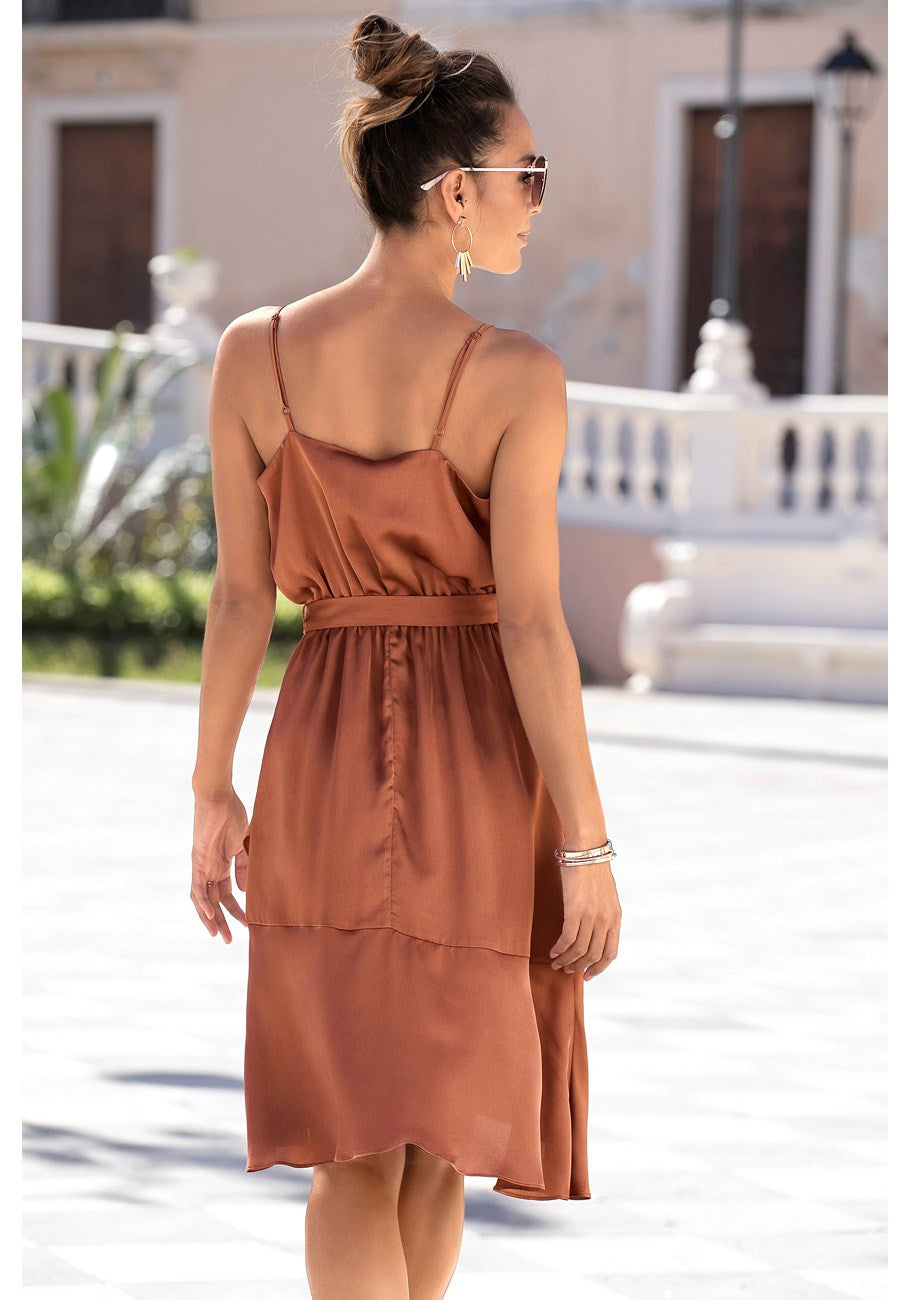 Игривое атласное платье с V-образным вырезом и регулируемыми бретелями для вечерних прогулок по городу.