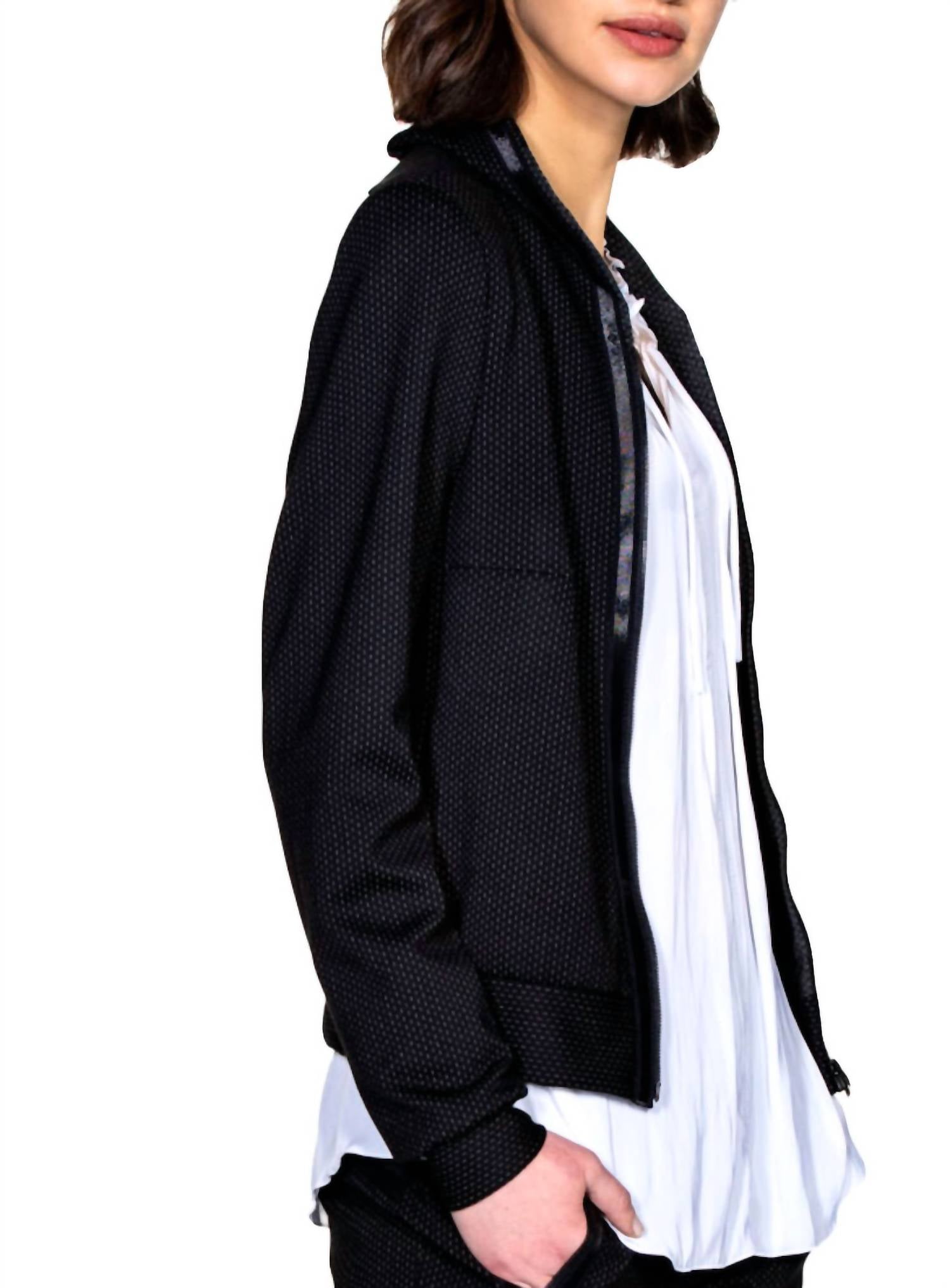 Куртка настолько универсальна, что ее можно носить буквально с чем угодно. Куртка COLON tech от Beate Heymann — классический стиль понте из этой коллекции. Великолепное качество трикотажа Beate Heymann с двухсторонней молнией спереди и сборчатым воротником. Слегка набитые плечи (можно снять) для легкого структурированного силуэта. Фантастический эластичный трикотаж черного цвета с мелкими белыми точками.