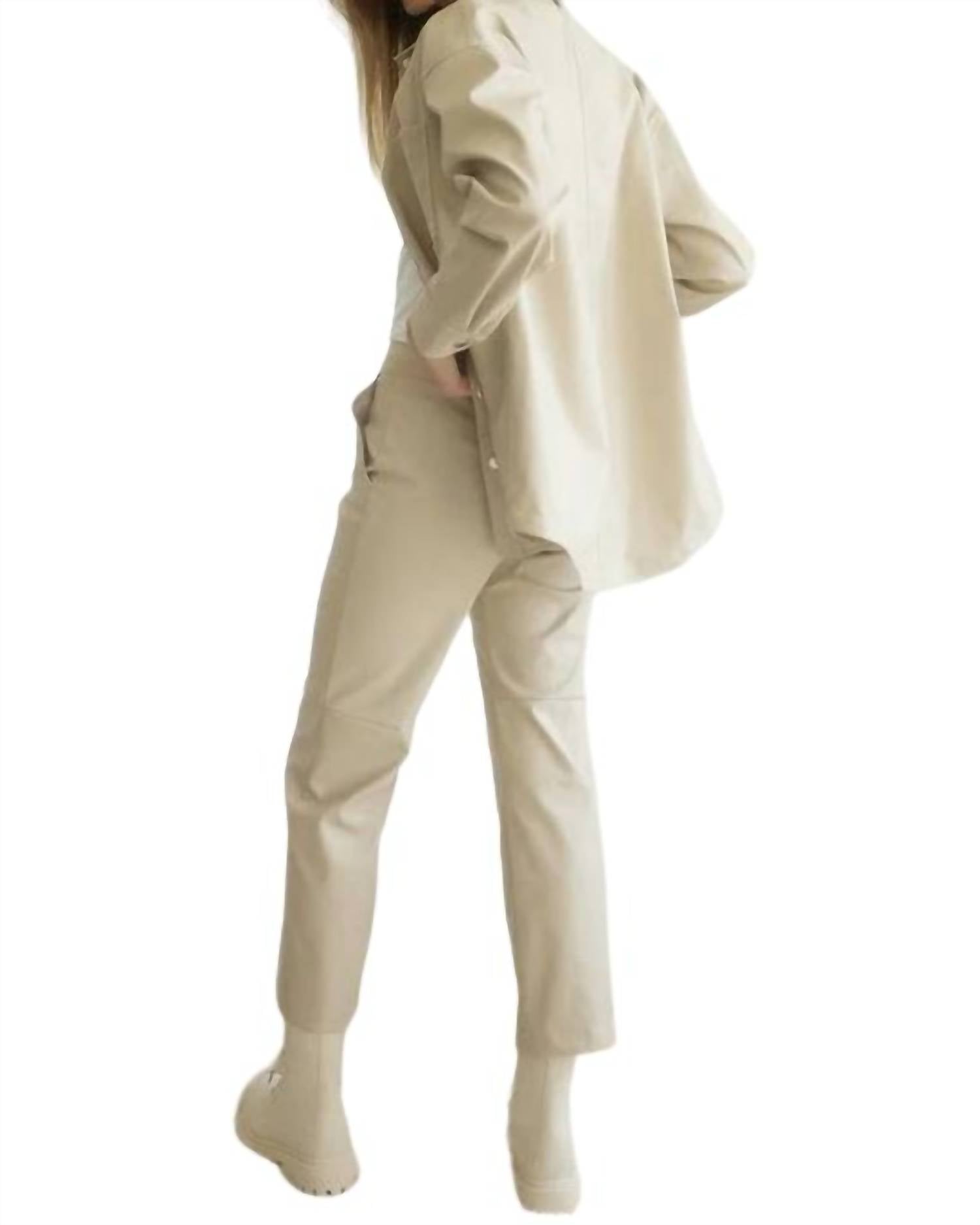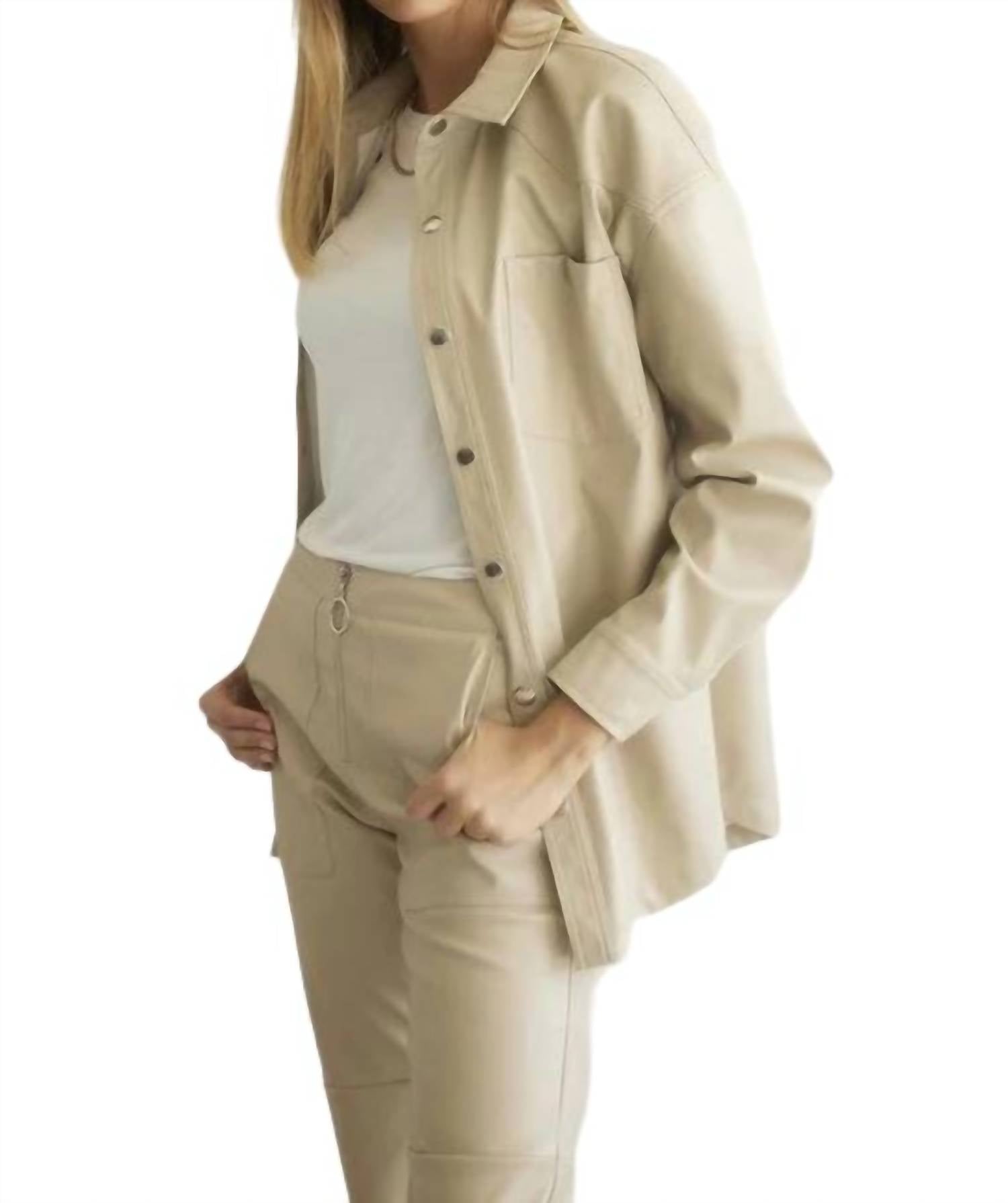 Застежка на пуговицы, материал из искусственной кожи. Острый воротник. Длинный рукав. Нагрудные карманы. Свободный крой.