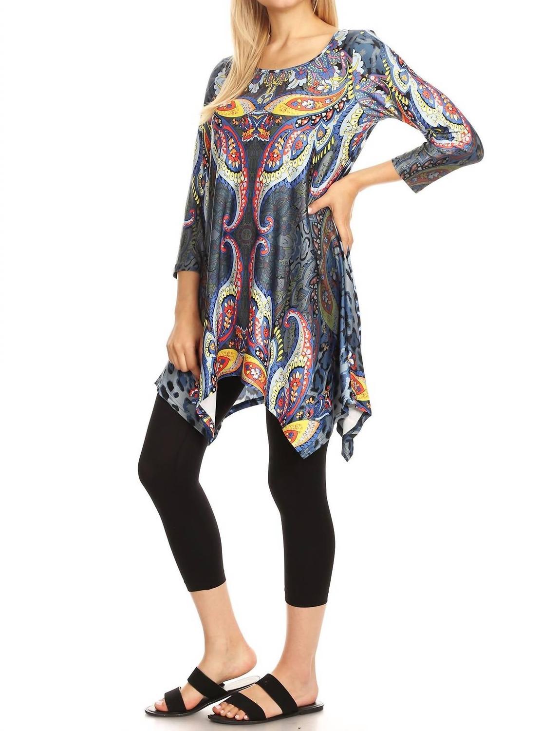 Эта облегающая туника от White Mark великолепно драпируется на вашем теле. Рукава 3/4, разноцветный узор пейсли и анималистичный принт, овальный вырез и два скрытых боковых кармана. Материал - 95% полиэстер и 5% спандекс.