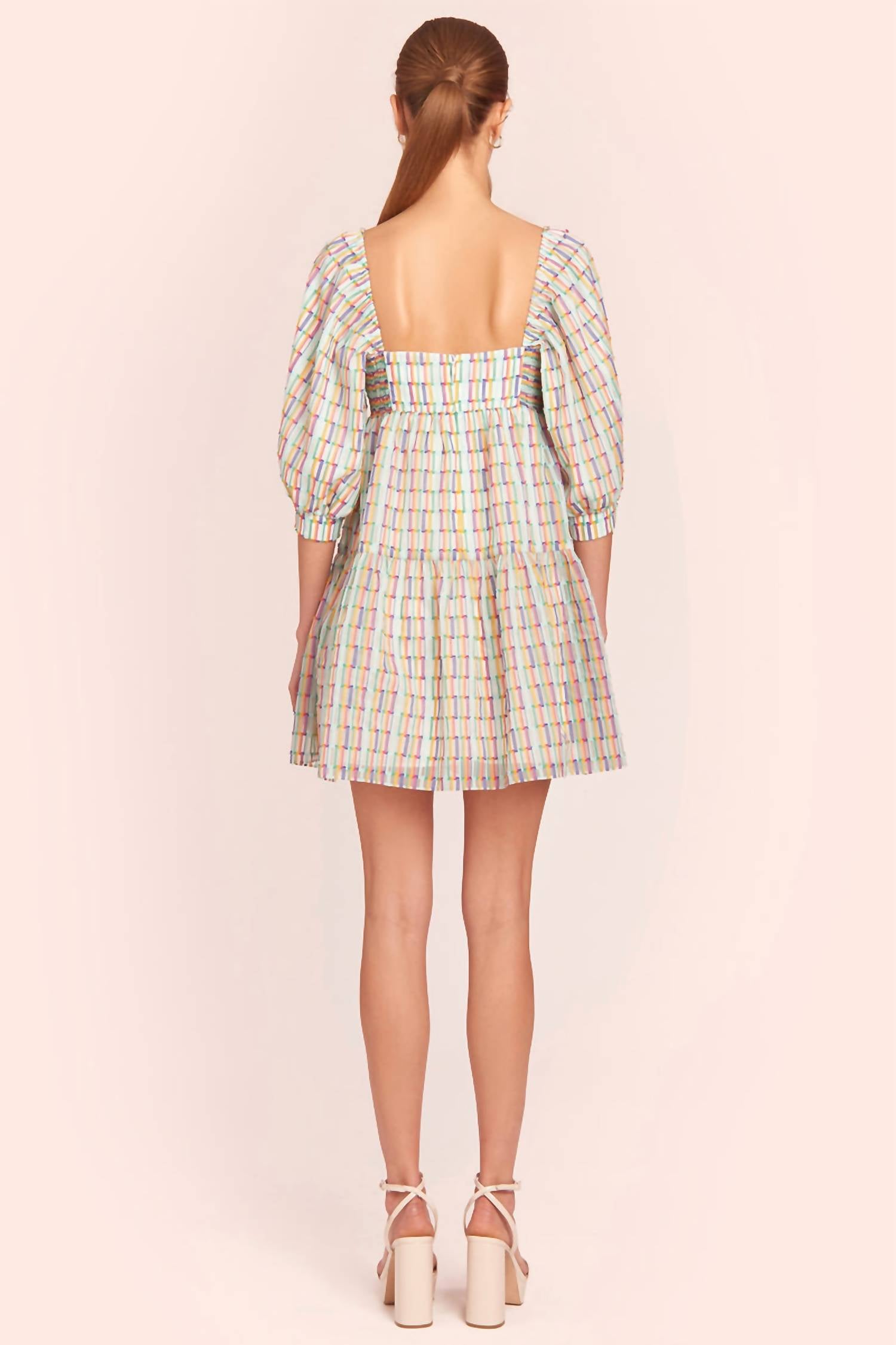 Легкое и подчеркивающее достоинства платье, которое вы будете носить в течение всего сезона. Мини-платье. Квадратный вырез. Рукава-фонарики три четверти. Рост модели 5 футов 10 дюймов, размер Small. Только сухая чистка.
